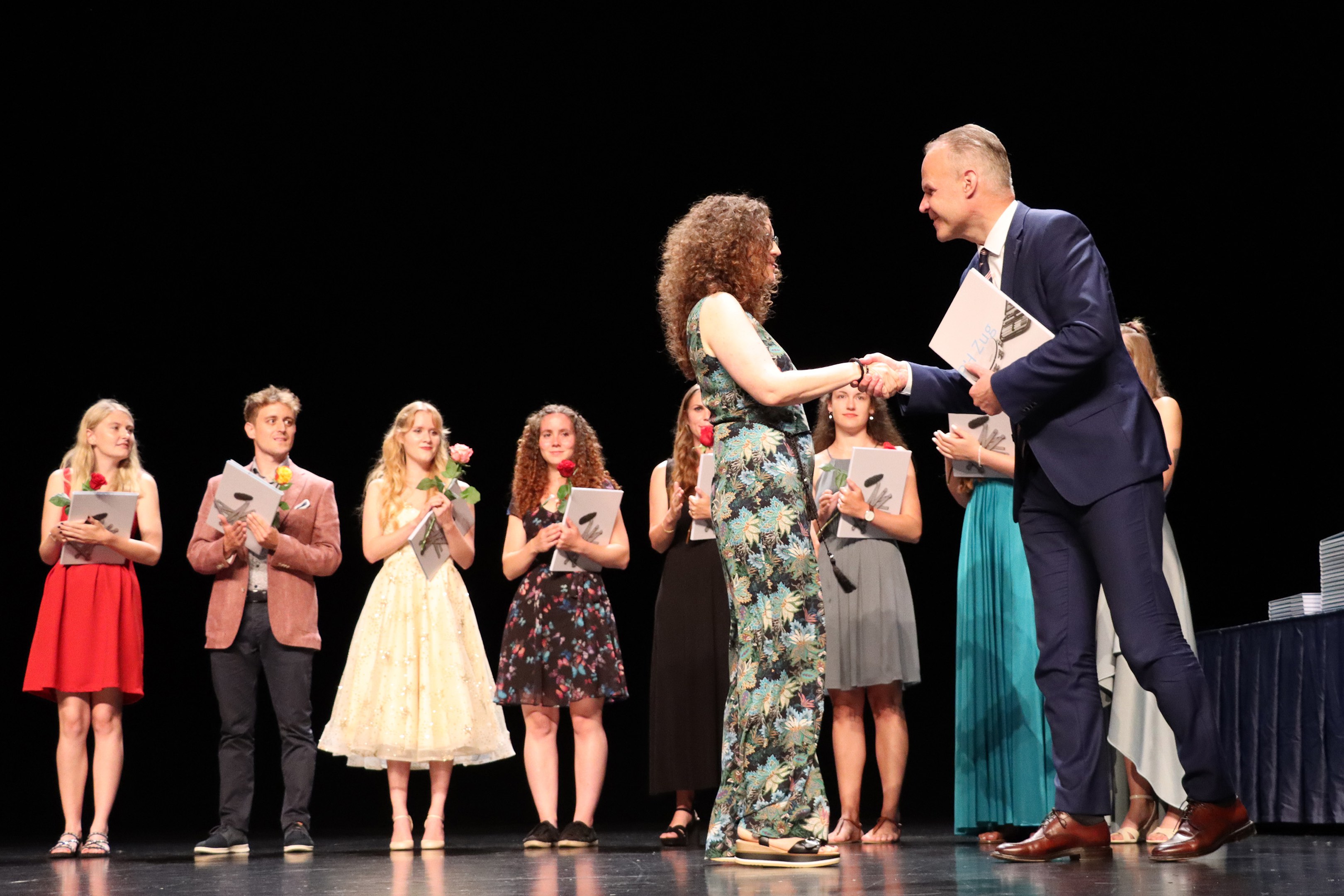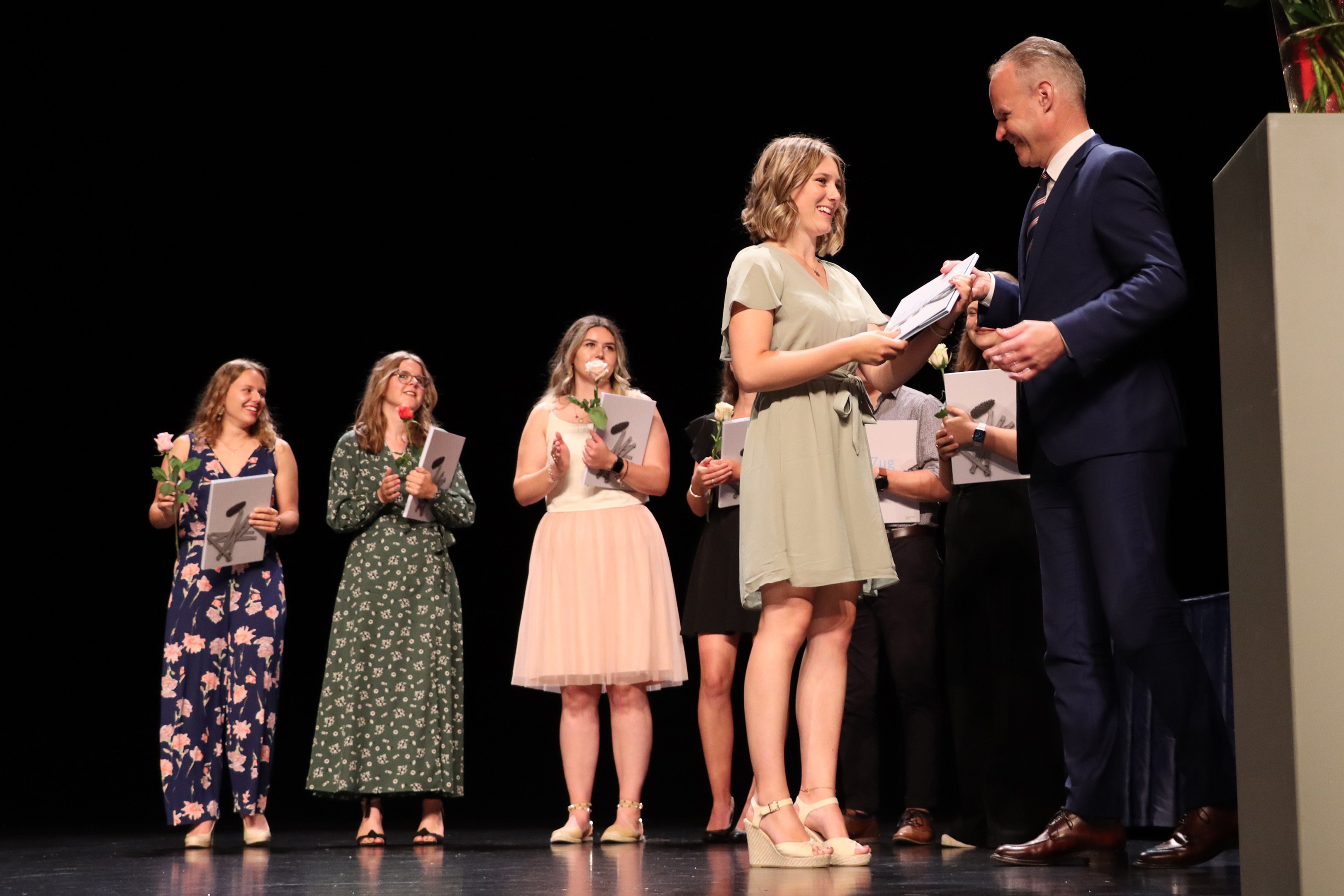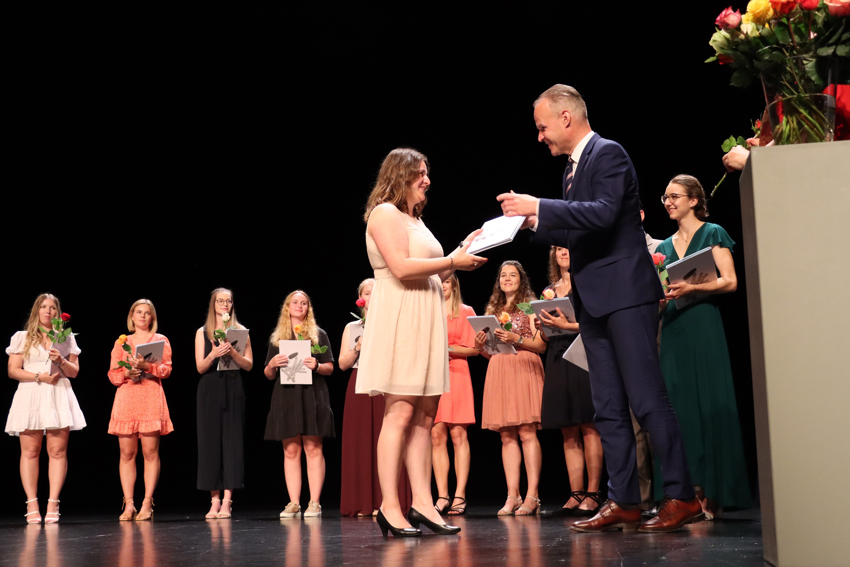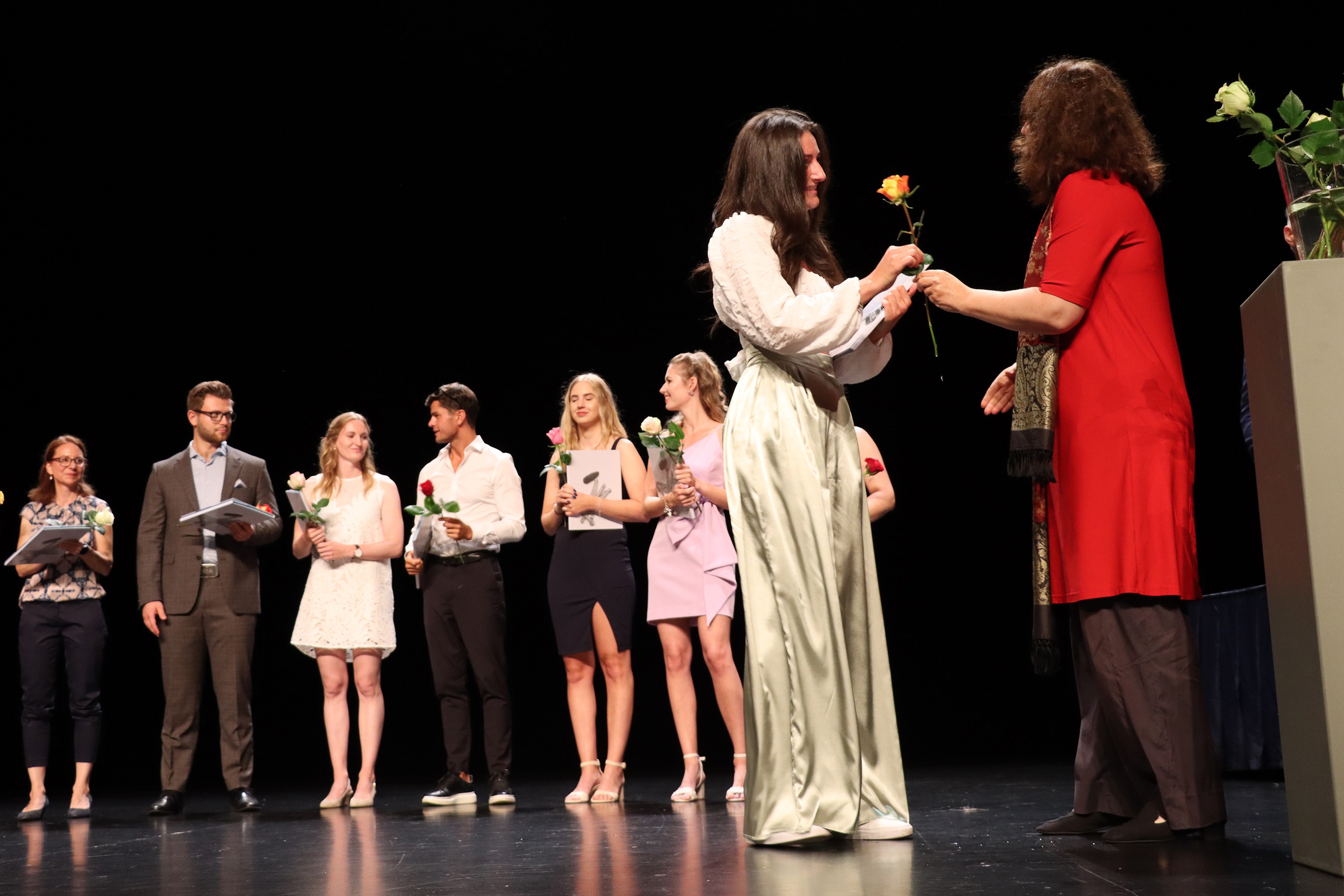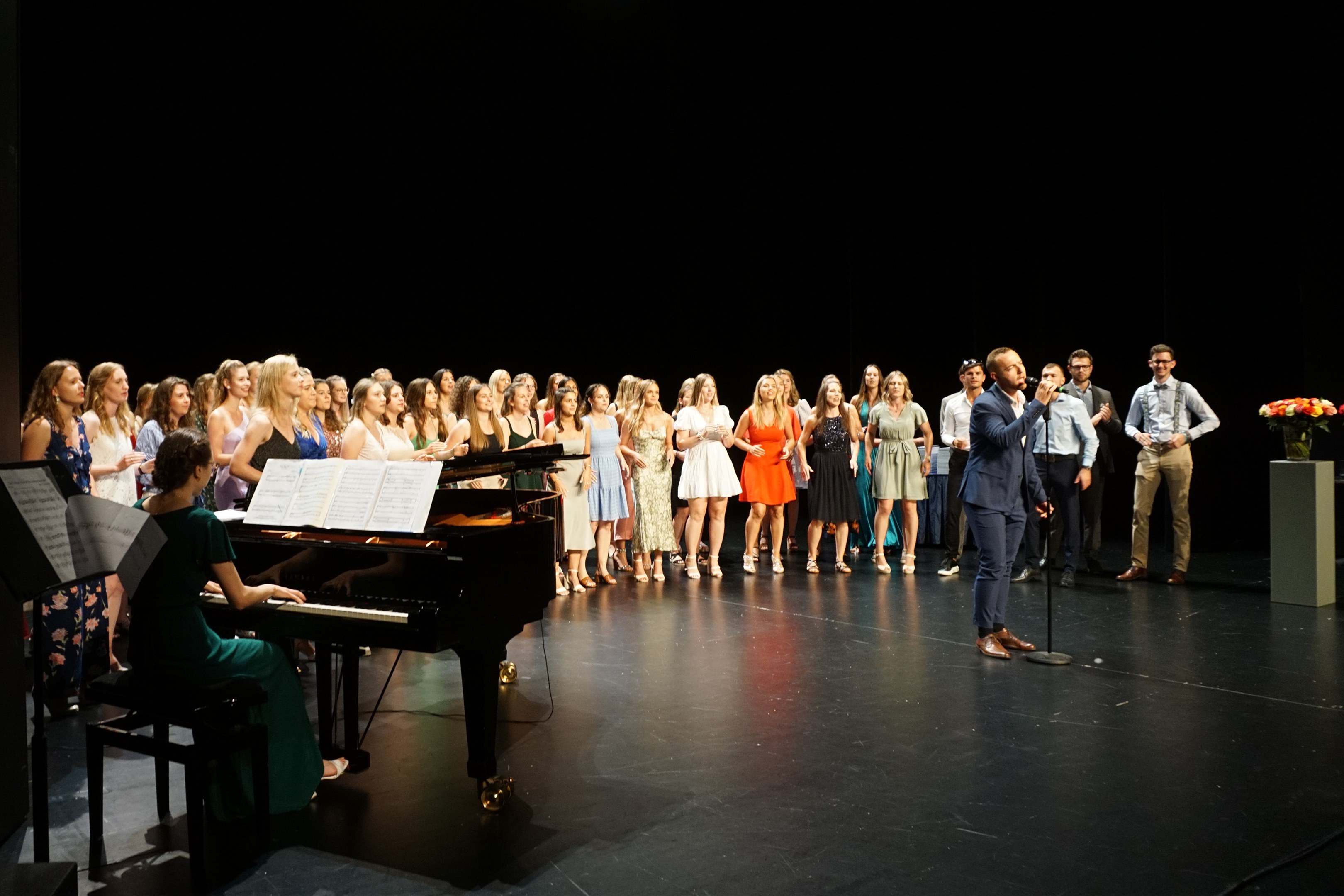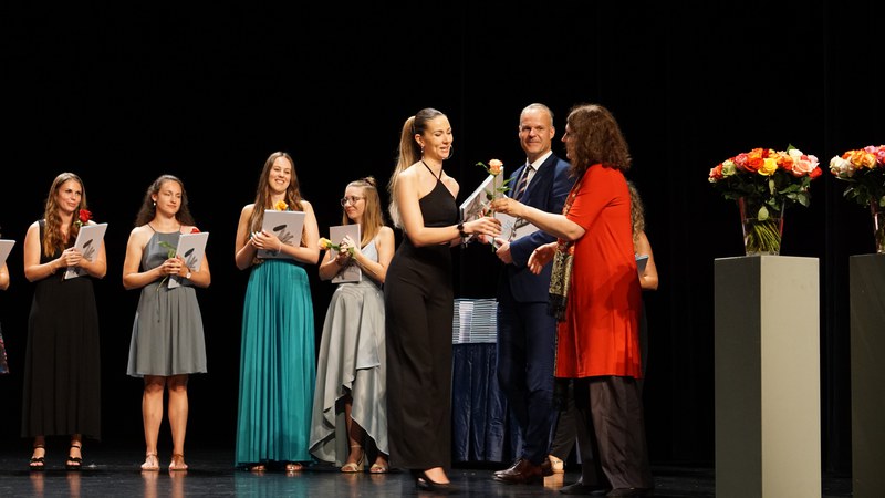 Moderiert wurde die Diplomfeier im Theater Casino Zug von Clemens Diesbergen, Prorektor und Leiter Ausbildung der PH Zug. Er führte durchs Programm und verdankte die Beiträge. Ein besonderer Dank kam der Studentin Elsa Nastase, die mit ihrer Geige und Klavierbegleitung den Auftakt wie auch den Abschluss der Feier gestaltete sowie den Studierenden des Abschlussjahrgangs mit der Vertiefung Musik, die die Feier mit Auszügen aus ihrem energiegeladenen Musical-Projekt bereicherten, zu. In ihrem Schlusswort wünscht auch die Rektorin Esther Kamm den Studierenden alles Gute für ihren beruflichen Weg und bedankte sich für deren Engagement im Studium.