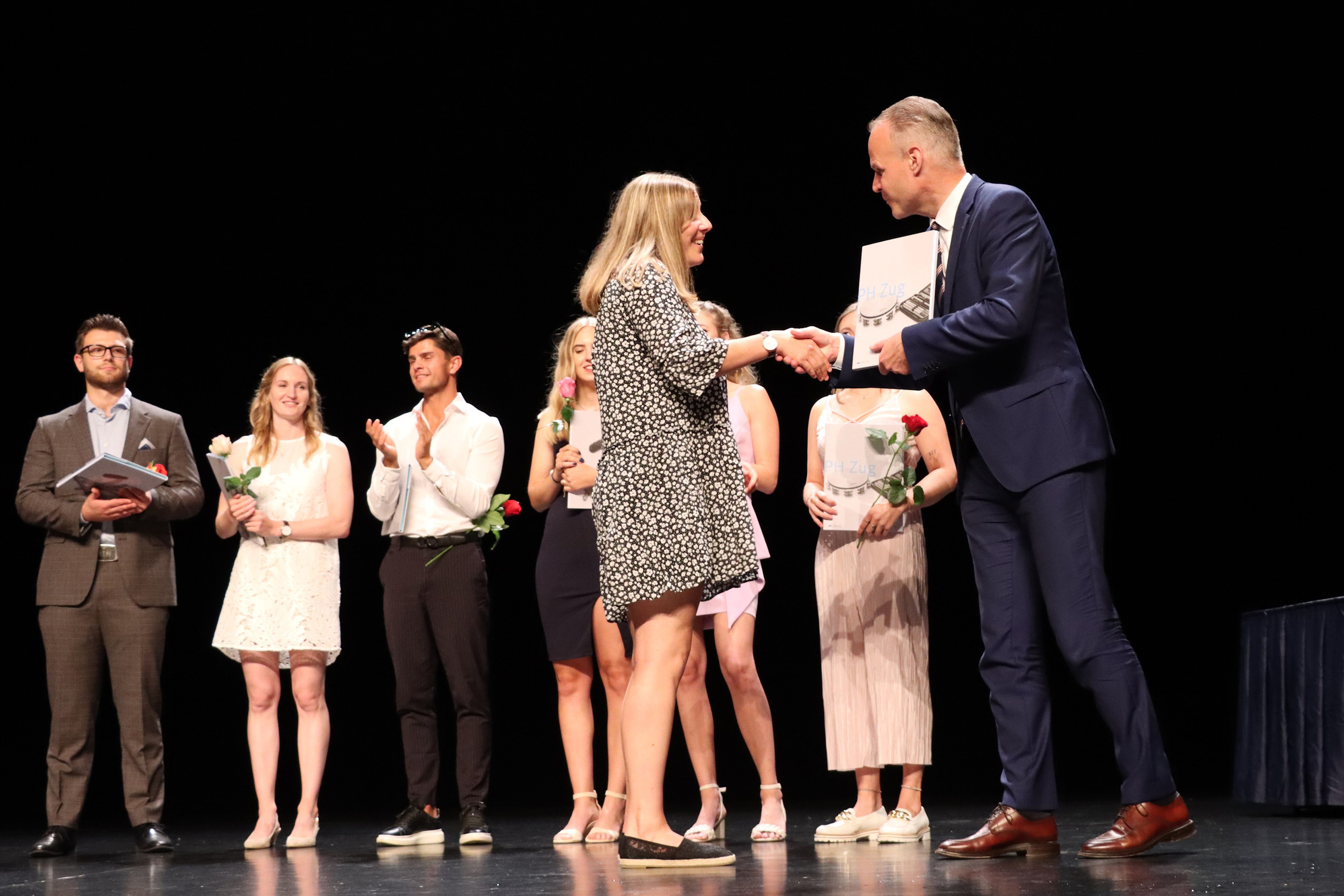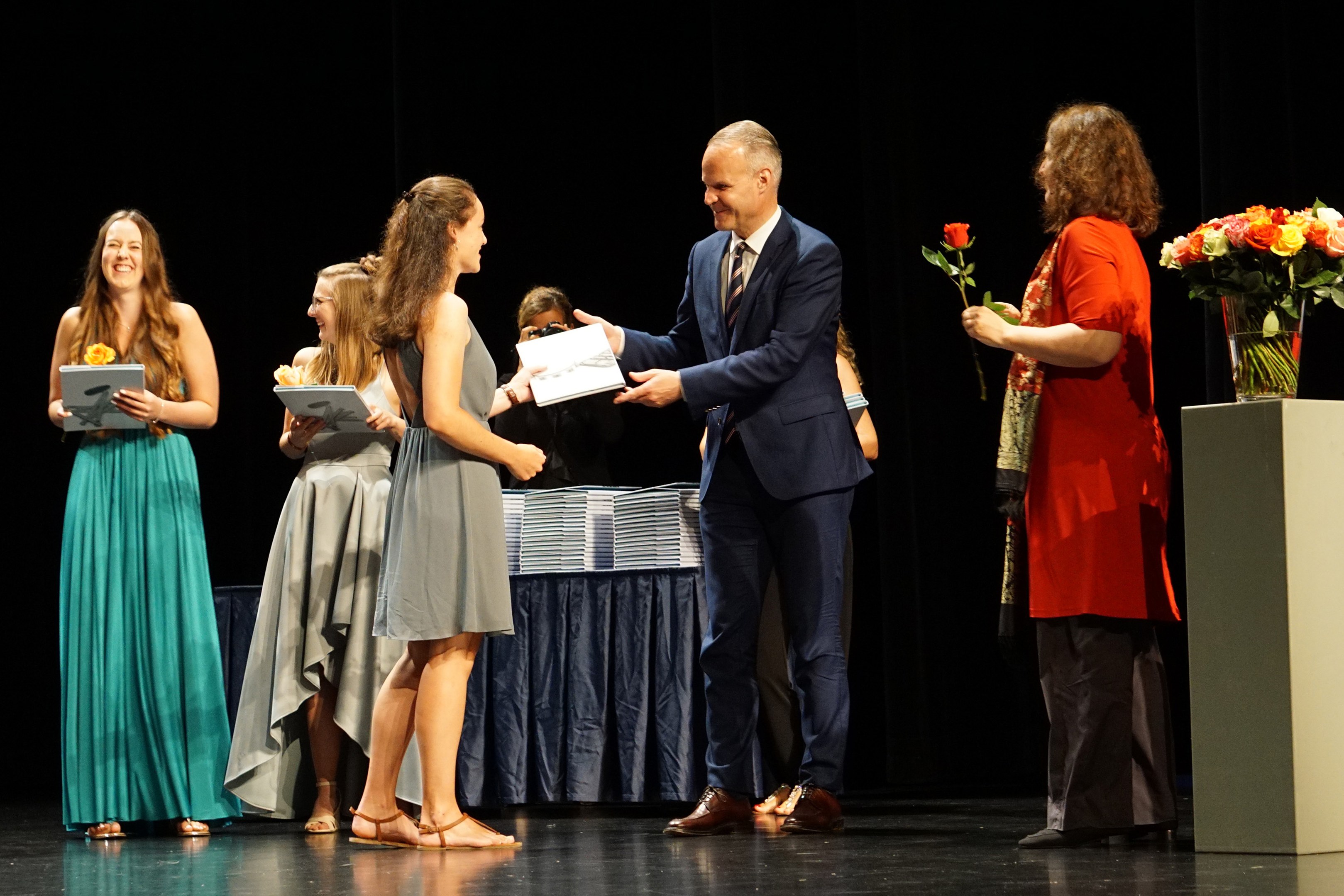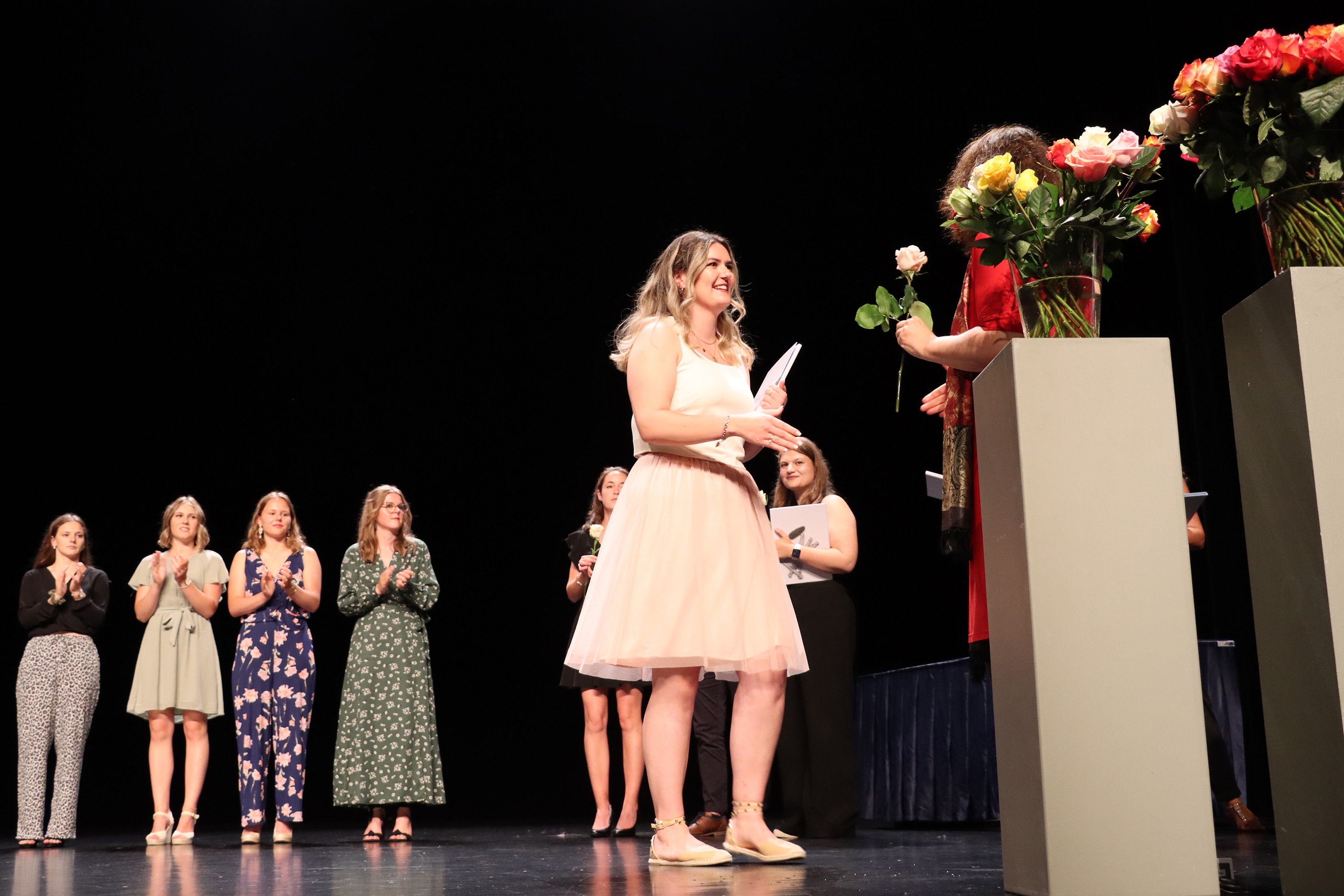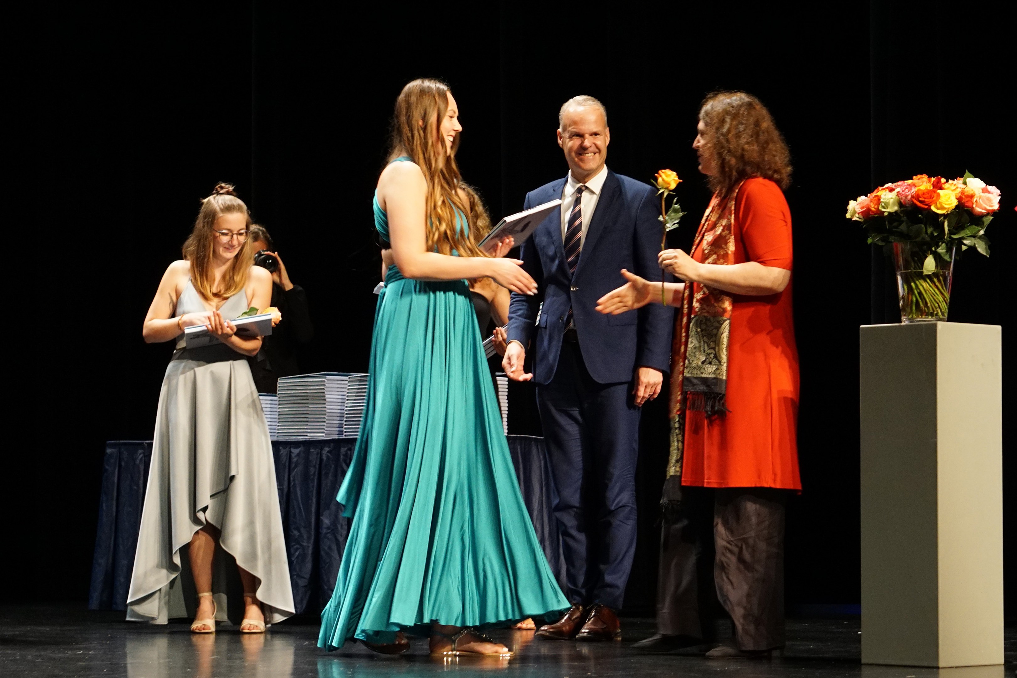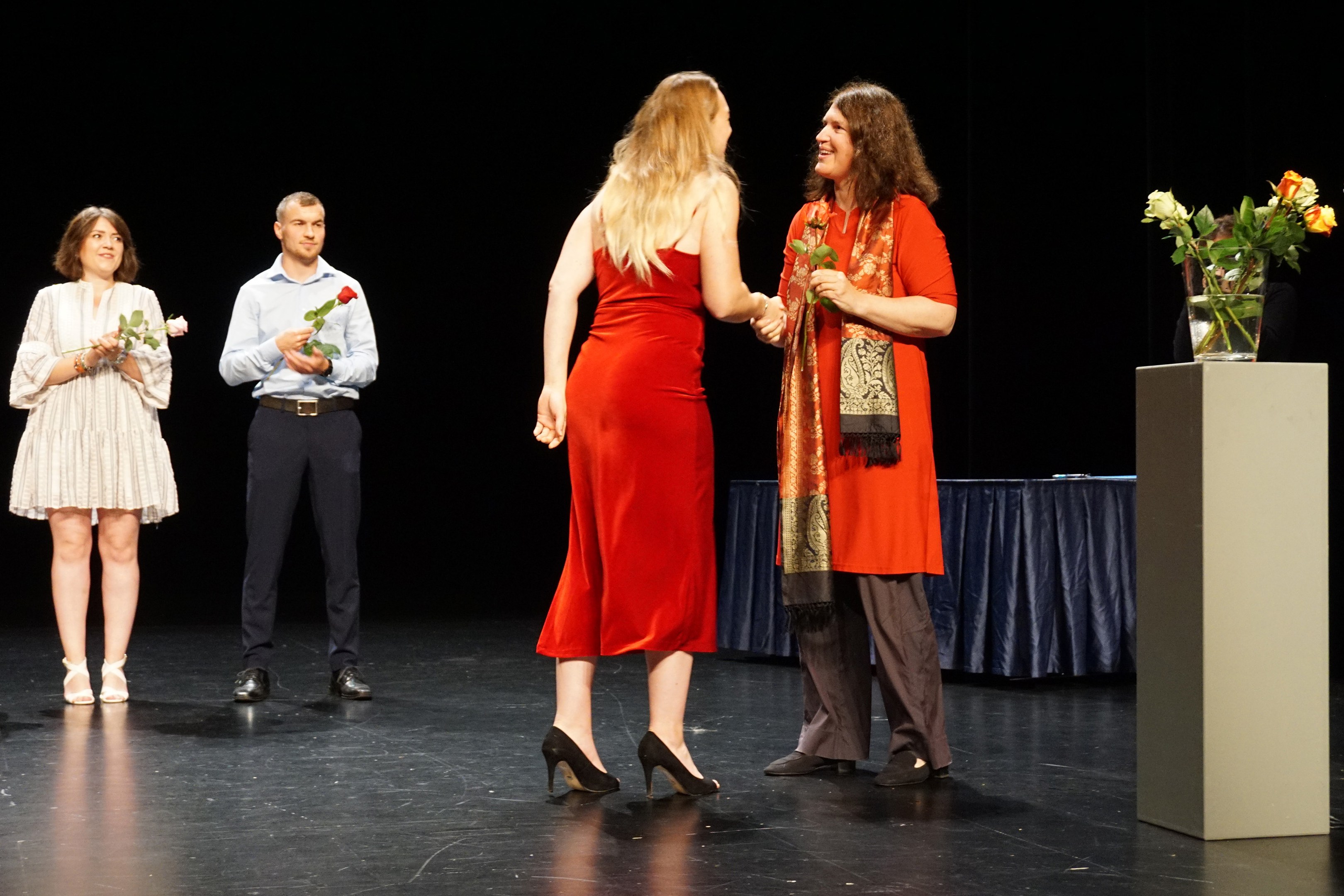 Moderiert wurde die Diplomfeier im Theater Casino Zug von Clemens Diesbergen, Prorektor und Leiter Ausbildung der PH Zug. Er führte durchs Programm und verdankte die Beiträge. Ein besonderer Dank kam der Studentin Elsa Nastase, die mit ihrer Geige und Klavierbegleitung den Auftakt wie auch den Abschluss der Feier gestaltete sowie den Studierenden des Abschlussjahrgangs mit der Vertiefung Musik, die die Feier mit Auszügen aus ihrem energiegeladenen Musical-Projekt bereicherten, zu. In ihrem Schlusswort wünscht auch die Rektorin Esther Kamm den Studierenden alles Gute für ihren beruflichen Weg und bedankte sich für deren Engagement im Studium.