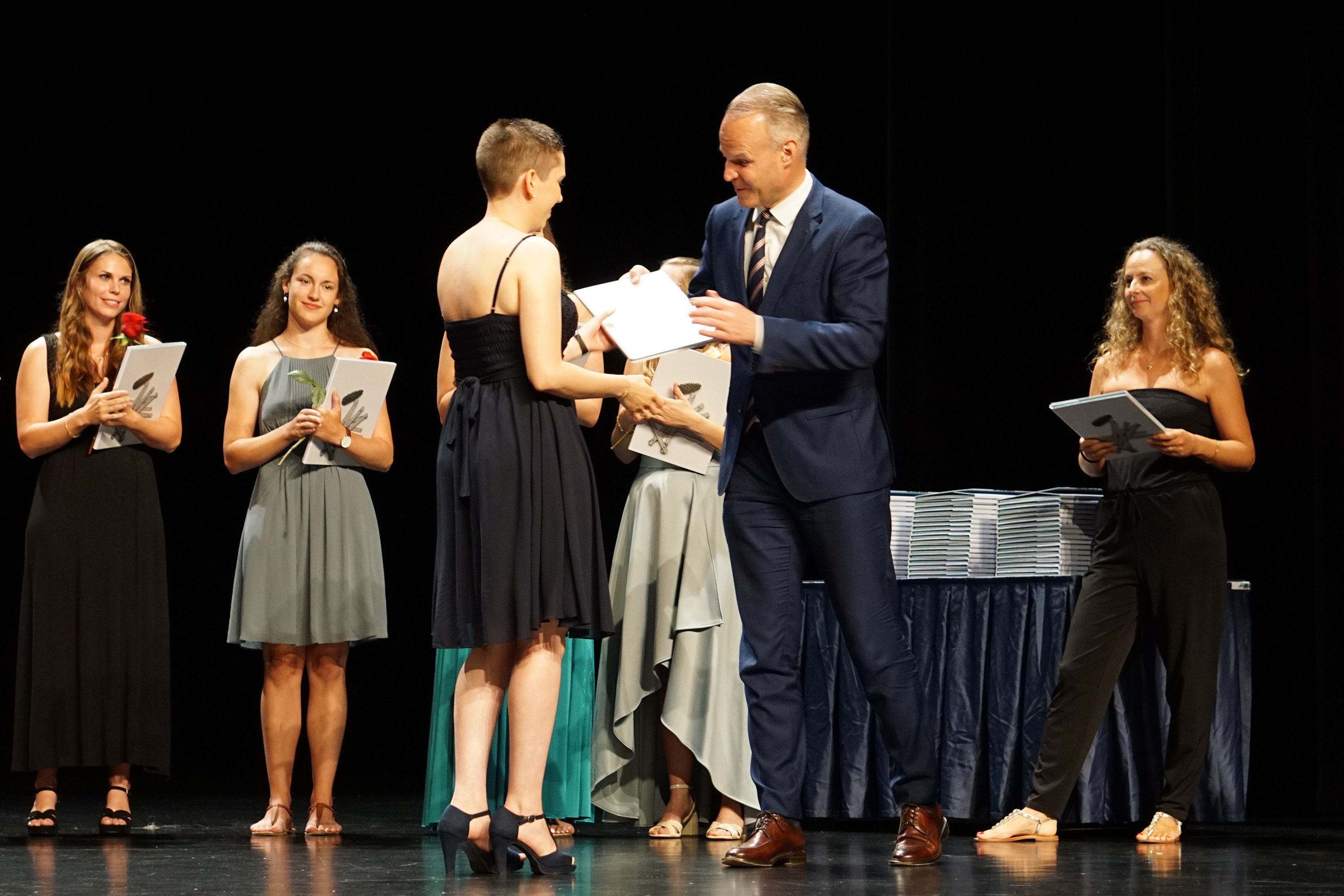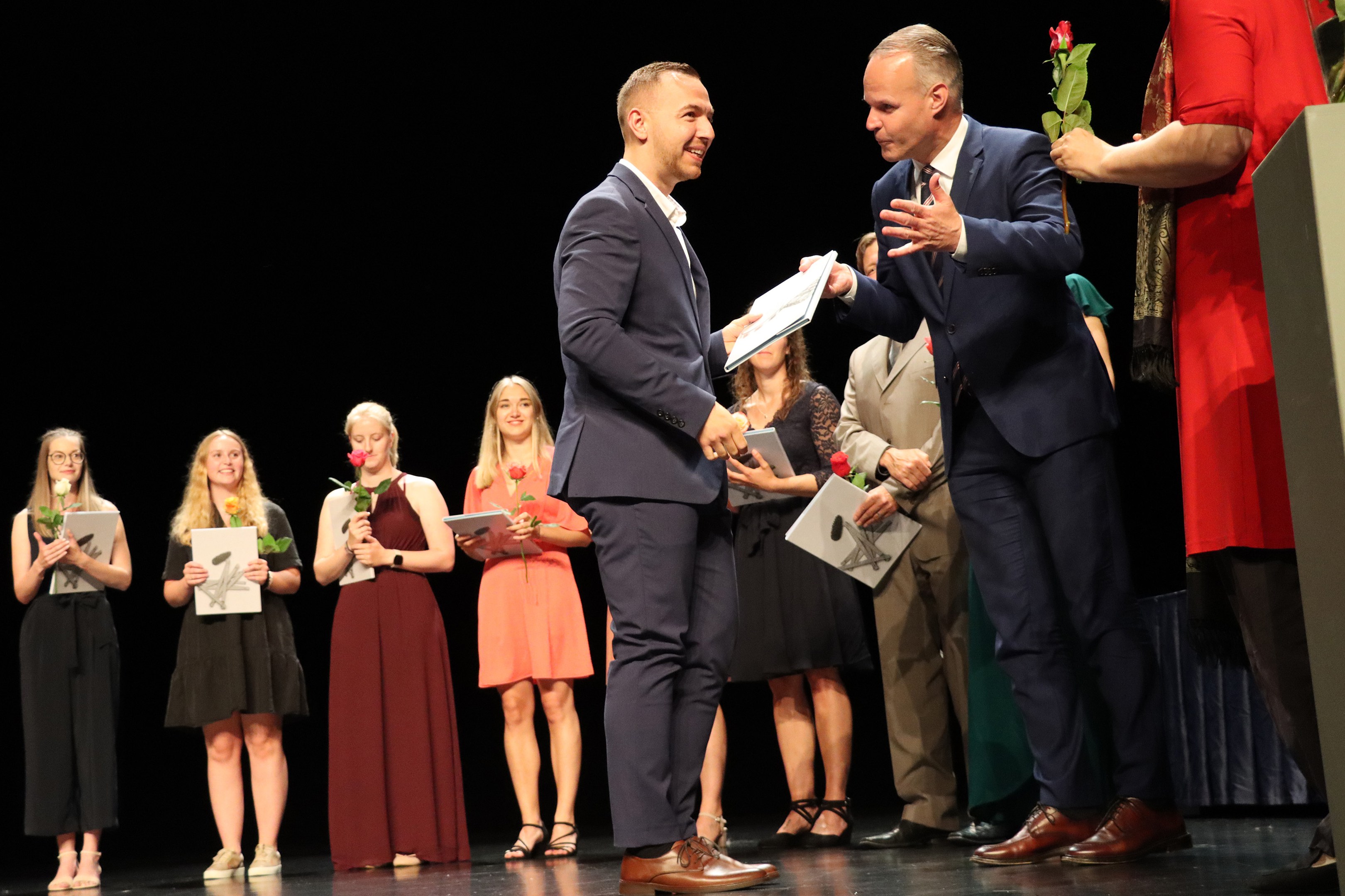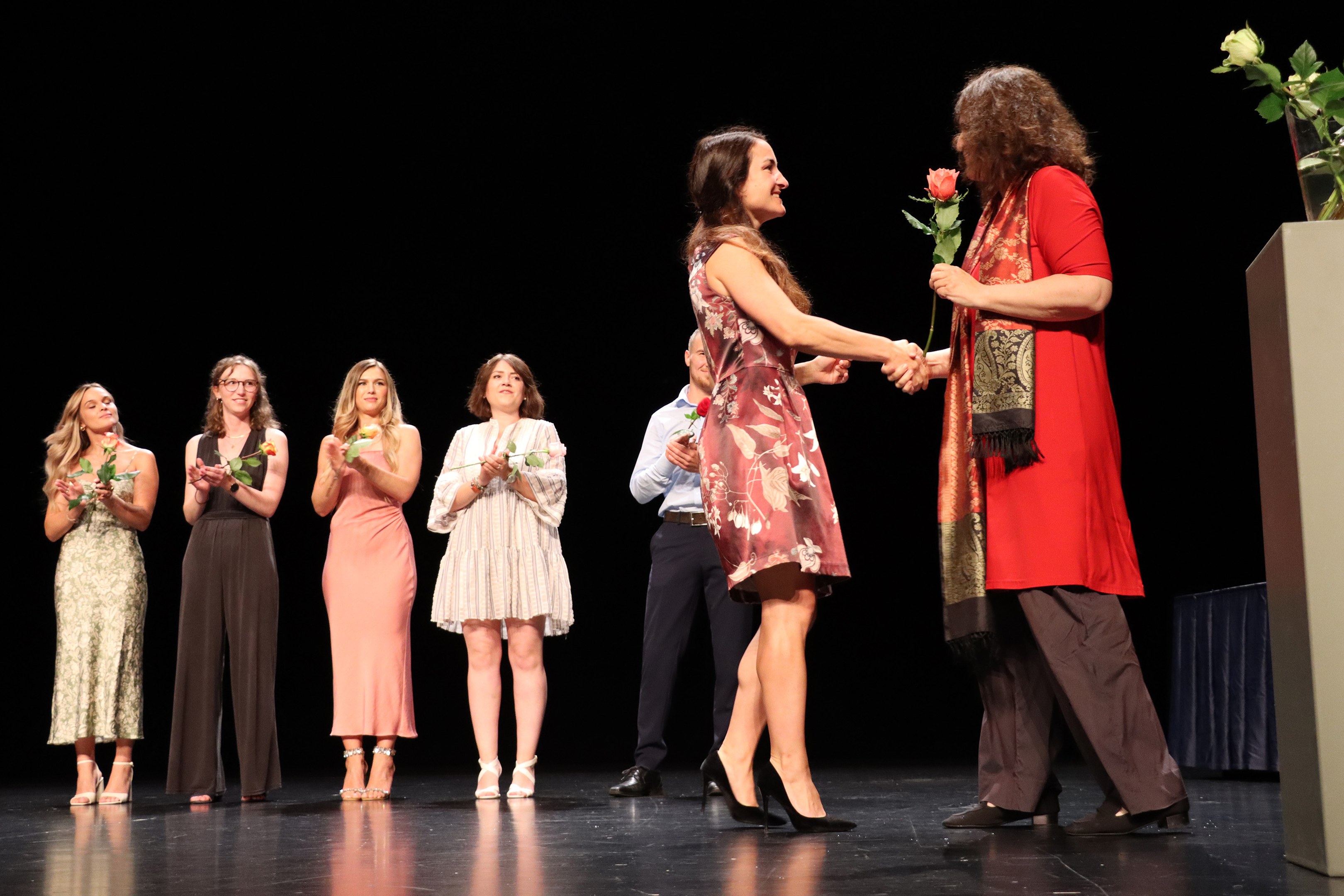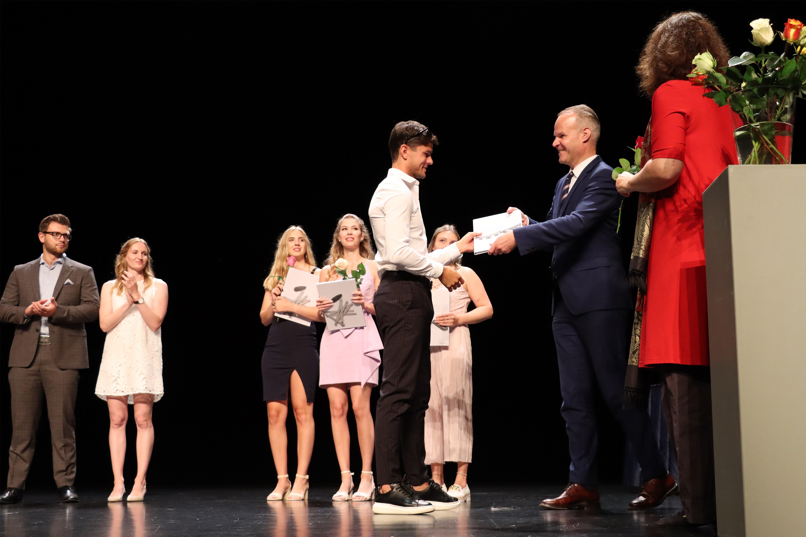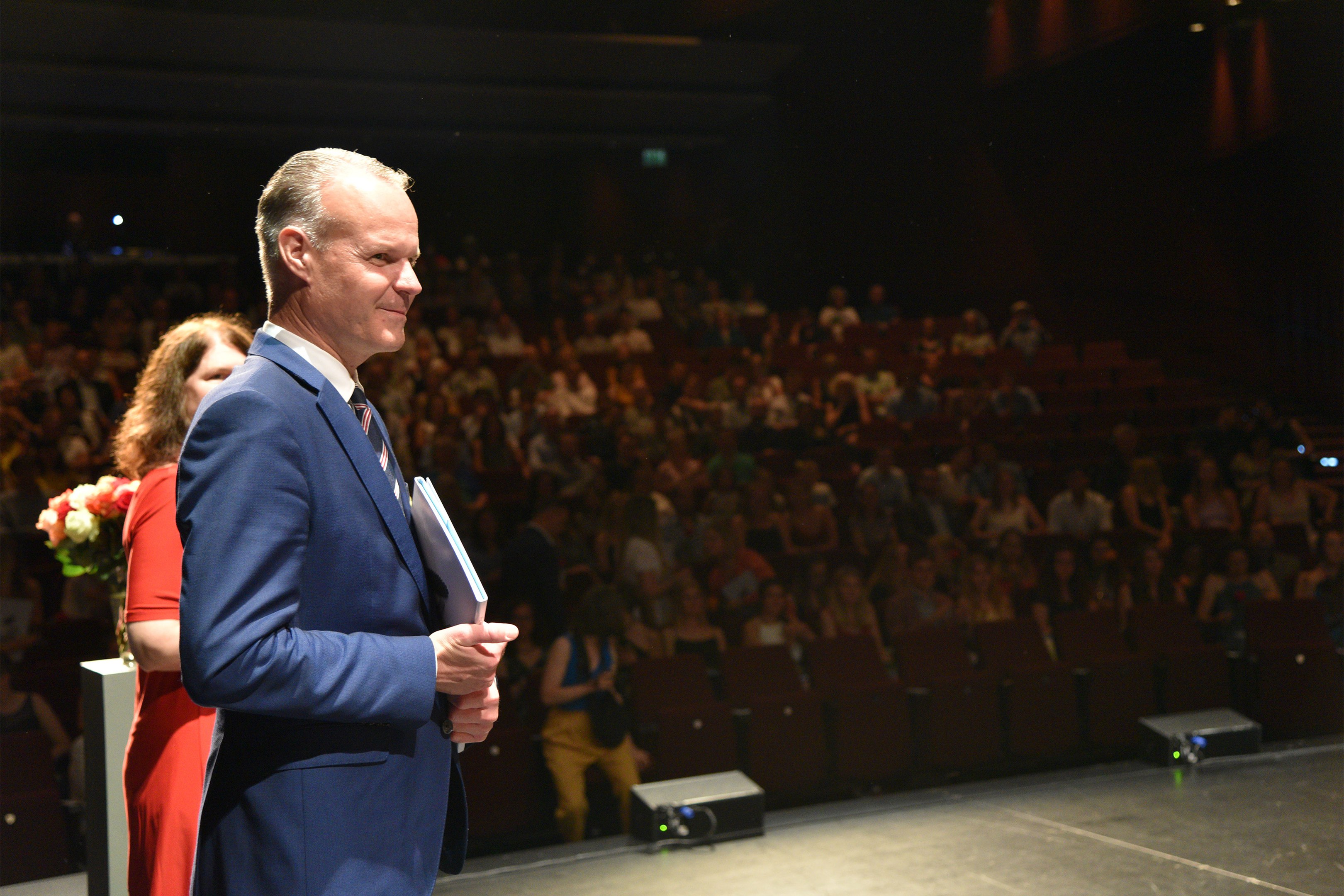 Moderiert wurde die Diplomfeier im Theater Casino Zug von Clemens Diesbergen, Prorektor und Leiter Ausbildung der PH Zug. Er führte durchs Programm und verdankte die Beiträge. Ein besonderer Dank kam der Studentin Elsa Nastase, die mit ihrer Geige und Klavierbegleitung den Auftakt wie auch den Abschluss der Feier gestaltete sowie den Studierenden des Abschlussjahrgangs mit der Vertiefung Musik, die die Feier mit Auszügen aus ihrem energiegeladenen Musical-Projekt bereicherten, zu. In ihrem Schlusswort wünscht auch die Rektorin Esther Kamm den Studierenden alles Gute für ihren beruflichen Weg und bedankte sich für deren Engagement im Studium.