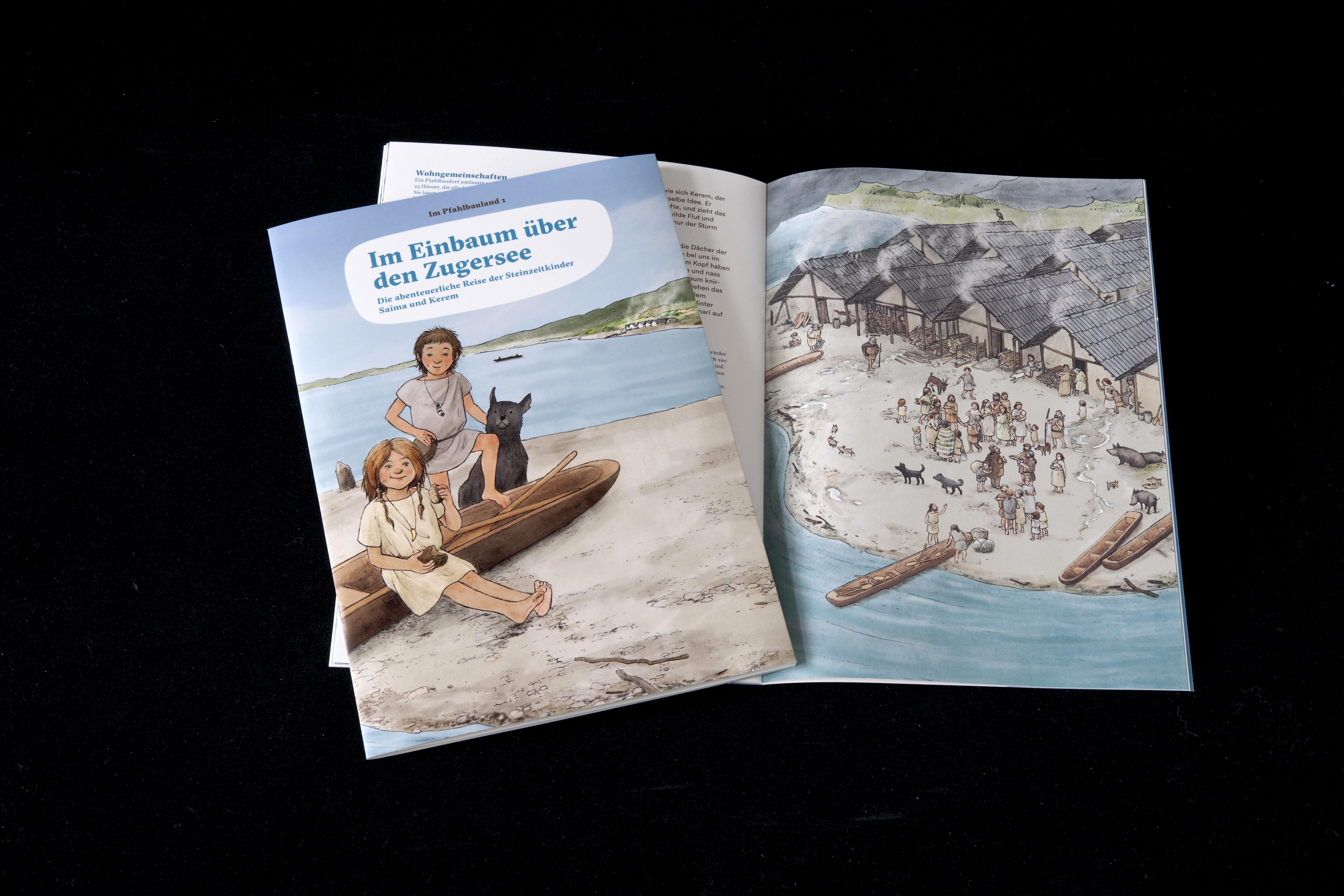| In der Reihe Museumsschriften des Museums für Urgeschichte(n) ist das aktuellste Produkt das Heft «Im Einbaum über den Zugersee. Die abenteuerliche Reise der Steinzeitkinder Saïma und Kerem», eine Erzählung für Kinder im Primarschulalter. Das Autorenteam Irmgard Bauer, Ulrich Eberli und Esther Schmid erzählt die abenteuerliche Geschichte zweier Kinder und vermittelt gleichzeitig Fakten zum Alltag der Pfahlbauer am Zugersee. Der wissenschaftliche Hintergrund für die Geschichte basiert auf zahlreichen archäologischen Fundstellen, denn bereits zur Zeit der Pfahlbauer war das Ufer des Zugersees bewohnt. |