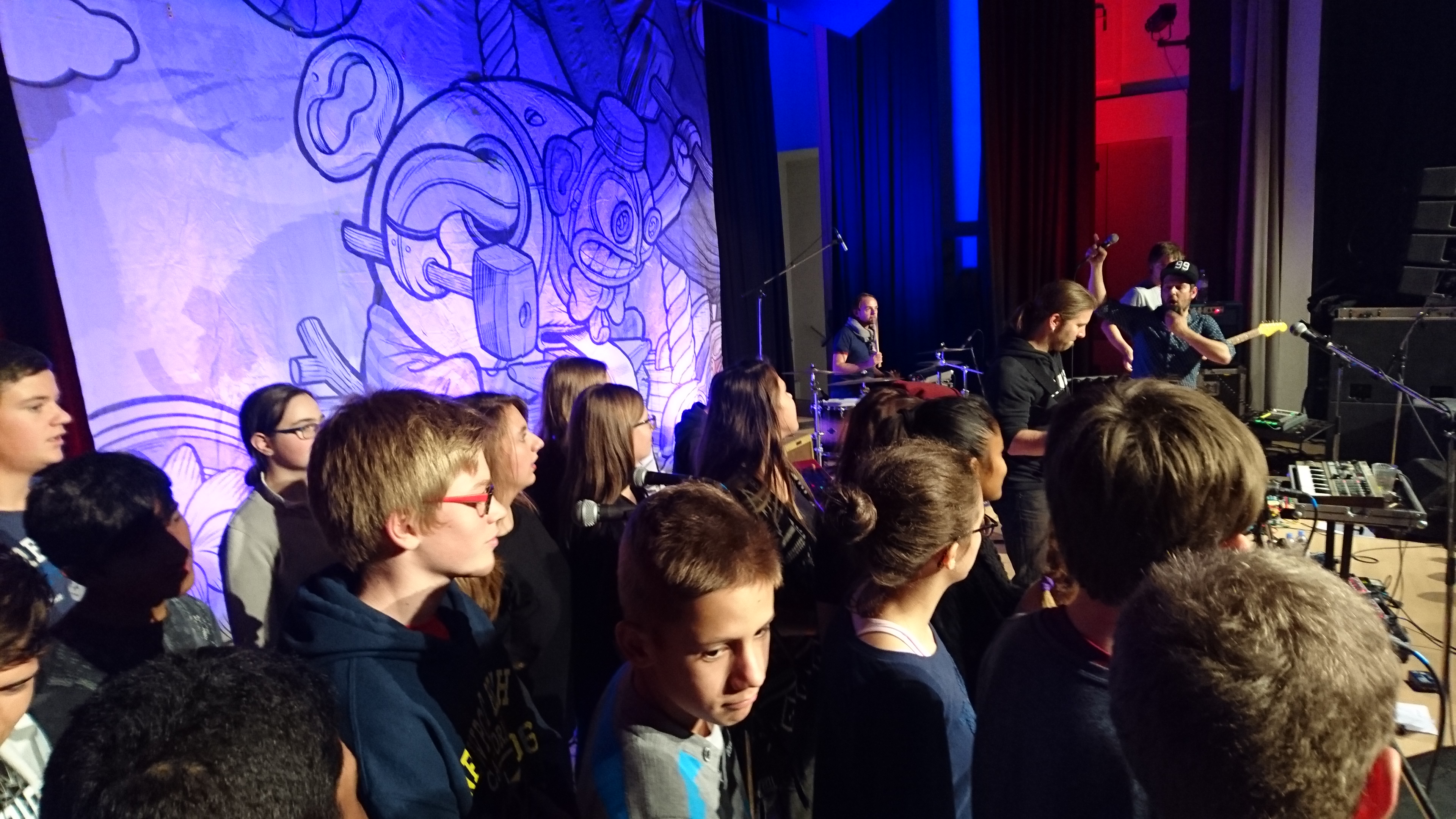 Was folgte, war ein spannender Nachmittag. Nach einer Vorstellungsrunde stand schnell die Musik im Zentrum. Da sich unter den Gästen sogar ein Profimusiker befand, erhielt die Übungsphase eine neue Komponente. Er suchte nach einem passenden Instrument, welches schnell gefunden war. Nun sangen wir den Song „Affenbande" der Berner Band „Halunke" wohlgemerkt auf Berndeutsch (was für alle — Einheimische wie Gäste — eine Fremdsprache war) mit Begleitung Syrischer Trommelrhythmen. Durch die gemeinsamen Sprachschwierigkeiten und durch die Verbindung der musikalischen Elemente, welche sich wunderbar ergänzten, wandelte sich der Nachmittag langsam zu einer selbstverständlichen Probe, mit einem gemeinsamen Ziel. In kurzen Pausen entstanden spontane Gespräche und plötzlich tanzten zwei der Gäste einen traditionellen Tanz vor. Dies erstaunte einige Schülerinnen und Schüler. Das ganze Rollenverständnis wurde ein weiteres Mal arg strapaziert. Wir schlossen die Probe erfolgreich ab.