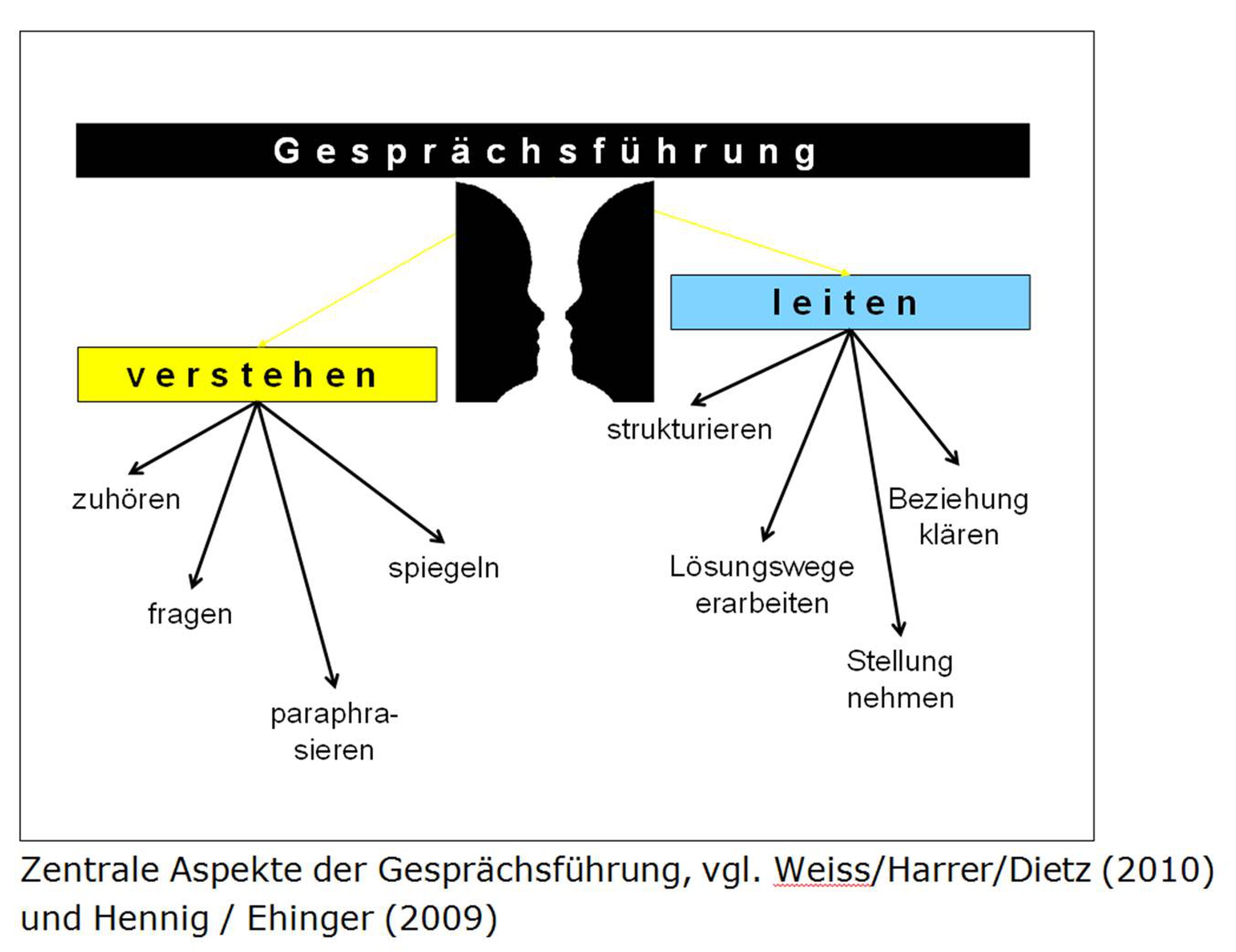 Es lernt zwar jeder Mensch in seiner Alltagserfahrung mit seinen Mitmenschen zu reden. Unter Gesprächsführung ist jedoch mehr als diese informelle Kommunikation zu verstehen. Geplante, strukturierte und regelmässige Gespräche bilden die Grundlage für eine gesteuerte und kommunikative Zusammenarbeit: Gespräche mit Schülerinnen und Schülern, mit Kolleginnen und Kollegen, mit Vorgesetzten, mit Eltern; Mitarbeiter-, Zielvereinbarungs-, Fördergespräche; Besprechungen und Sitzungen in Arbeitsgruppen und Teams. Ein Gespräch kann zu einem kreativen Miteinander werden, in dem unterschiedlichste Fragen erörtert, Probleme bearbeitet, Konflikte bewältigt, Vereinbarungen getroffen werden und vieles mehr.