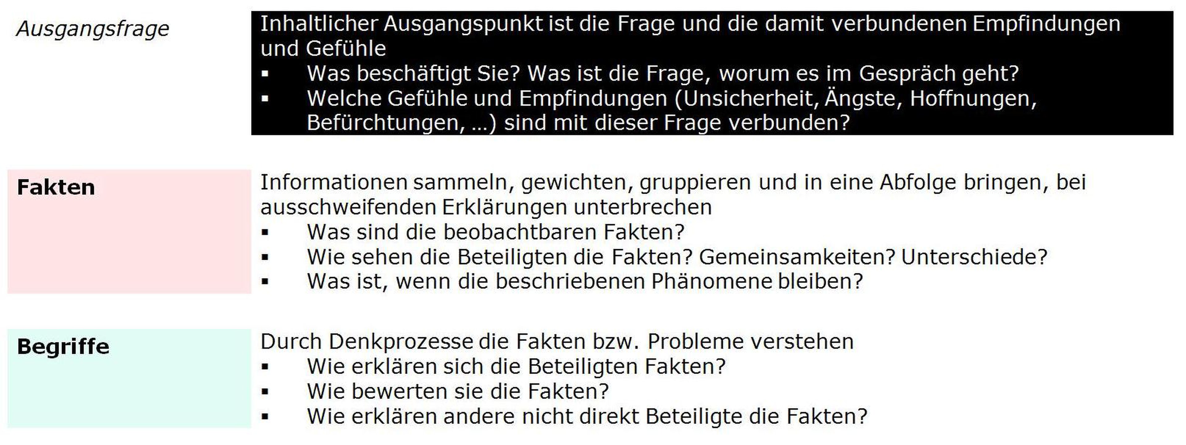 Der Prozess beginnt mit einer Ausgangsfrage einschliesslich ihrer emotionalen Qualitäten. Sein Ende, immer als vorläufiges Ende gedacht, mündet in einen Beschluss, eine Vereinbarung. Die Gesprächspartner halten fest, was sie im Gespräch erreicht haben und wie sie verbleiben.