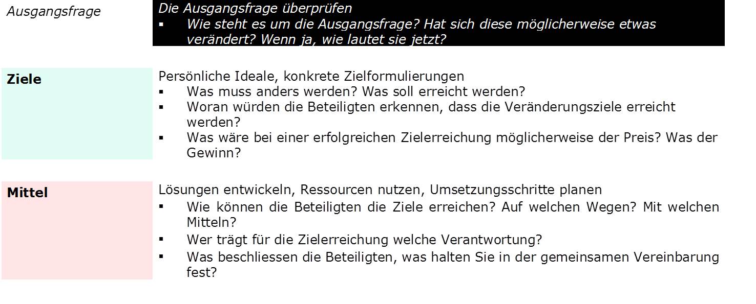 Klare Veränderungsziele sind die Voraussetzung für Lösungsentwicklungen. Die lösungsorientierte Haltung vermeidet jede Pathologisierung des Gegenübers. Sie sucht auch nicht nach so genannt schuldigen Anderen, sondern richtet den Fokus der Aufmerksamkeit auf die Veränderungsziele und Lösungen.