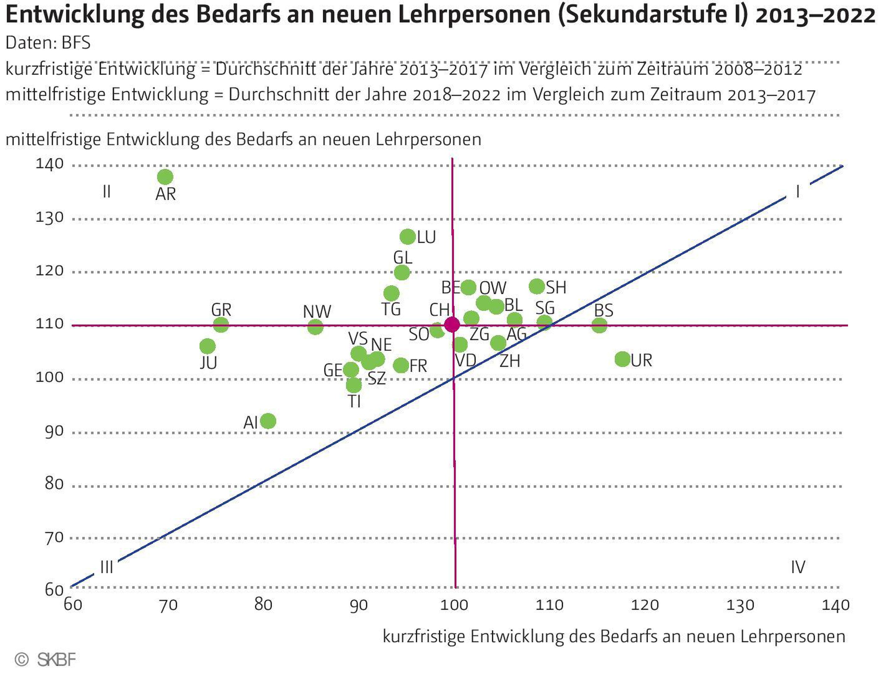 Die Achsen (rote Linien im Diagramm) stellen die jeweiligen schweizerischen Mittelwerte dar und ermöglichen einen interkantonalen Vergleich: Kantone in der rechten Diagrammhälfte erfahren in der kurzen Frist (d. h. im Zeitraum 2013–2017) einen im schweizerischen Vergleich überdurchschnittlichen Anstieg ihres Rekrutierungsbedarfs, Kantone in der linken Hälfte hingegen einen unterdurchschnittlichen. Die obere Hälfte wiederum vereint Kantone, welche erst mittelfristig (d. h. im Zeitraum 2018–2022) einen überdurchschnittlichen Anstieg des Rekrutierungsbedarfs erfahren werden, und in der unteren Hälfte ist es umgekehrt. Die Quadranten repräsentieren also unterschiedliche Muster. Im ersten Quadranten finden sich Kantone wie Aargau, Solothurn, Bern oder Luzern, welche kurz- und mittelfristig einen überdurchschnittlichen Rekrutierungsbedarf aufweisen werden, während etwa die Westschweizer Kantone Neuenburg, Genf, Waadt, aber auch Zürich oder Basel-Stadt, einen unterdurchschnittlichen oder gar abnehmenden Bedarf an neuen Lehrkräften auf der Primarstufe verzeichnen (vgl. Grafik 1).