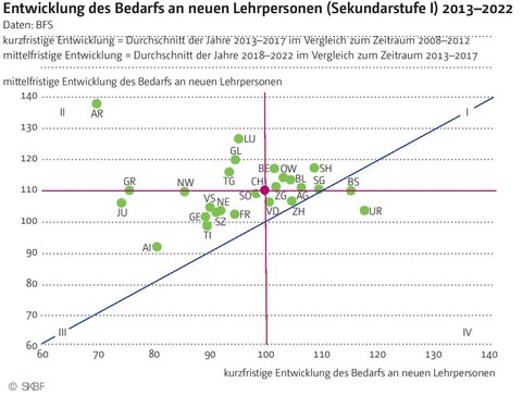 Zentrale Aussagen im Bildungsbericht Schweiz 2014 — Die meisten Kantone werden noch bis 2017 mit einem erhöhten Bedarf an Lehrpersonen auf der Primarstufe zu rechnen haben. Auf der Sekundarstufe I wird der Bedarf in den meisten Kantonen ebenfalls ansteigen, allerdings erst nach 2017 und deutlich moderater als dies für die Primarstufe prognostiziert wird. Zurückzuführen ist der Mehrbedarf an Lehrpersonen namentlich darauf, dass – aufgrund der Altersstruktur im Lehrkörper – mehr Lehrpersonen in Pension gehen werden und die Schülerzahlen ansteigen. Diese Entwicklungen werden regional und kantonal sehr unterschiedlich ausfallen. Es gibt auch Kantone, für die ein abnehmender Rekrutierungsbedarf prognostiziert wird.