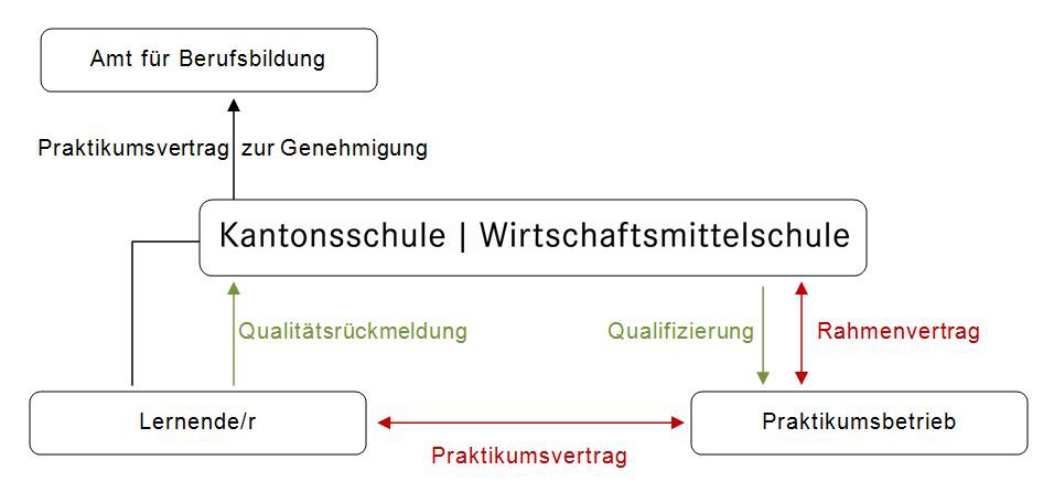 Betriebe, die einen Praktikumsplatz anbieten, werden durch die WMS Zug anhand einer Qualitätskarte qualifiziert. Danach wird zwischen der WMS Zug und dem Betrieb ein Rahmenvertrag, mit der/dem Lernenden ein Praktikumsvertrag geschlossen, der durch das Amt für Berufsbildung genehmigt wird.