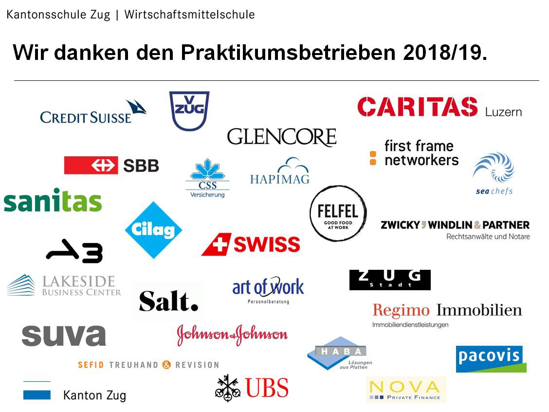 Betriebe im SJ 2018/19 welche einen Praktikumsplatz für Schülerinnen und Schüler der WMS Zug anbieten.