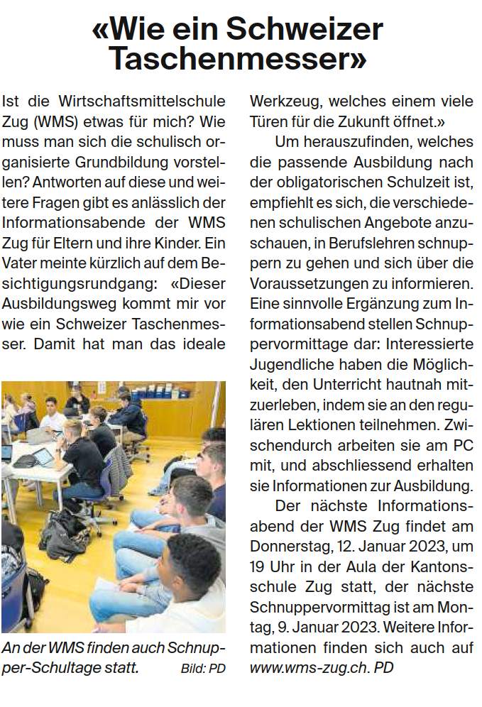 Ausbildung an der Wirtschaftsmittelschule Zug, Bericht Zuger Zeitung 30.11.22