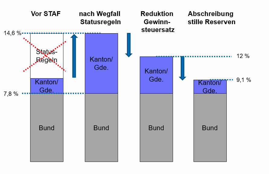 Die steuerlich aufgedeckten stillen Reserven sind bei der Bemessung des steuerbaren Eigenkapitals zu berücksichtigen, wobei sie sich im Umfang der Abschreibungen jährlich reduzieren. Erfüllt eine Gesellschaft die Voraussetzungen gemäss §§ 68 und 69 StG trotz Statuswechsels für Gewinnsteuerzwecke weiterhin, so wird ihr Kapital auf Antrag der Gesellschaft gemäss § 75 StG bis zum Inkrafttreten der STAF weiterhin nach den Regeln für Holding-, Domizil- oder gemischte Gesellschaften besteuert. Ab dem 1. Januar 2020 werden die steuerlich aufgedeckten stillen Reserven aufgrund §72 Abs. 1a StG mit einer Ermässigung von 98 % in die Bemessungsgrundlage miteinbezogen.