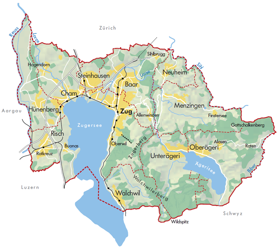 Der Kanton Zug ist politisch in 11 Gemeinden eingeteilt. Die vier Gemeinden Oberägeri, Unterägeri, Menzingen und Neuheim gehören zur Bergregion. Die Gemeinden Zug, Baar, Steinhausen, Risch, Cham, Hünenberg und Walchwil zur Talregion. Sie umschliessen den Zugersee zum grossen Teil.