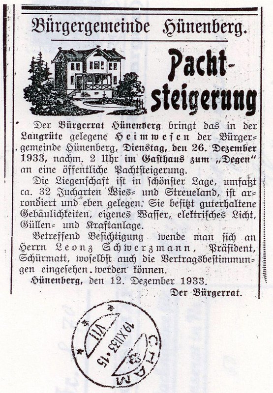 Die Armenkommission Hünenberg kauft von den Brüdern Alois und Kaspar Baumgartner die Liegenschaft Langrüti.