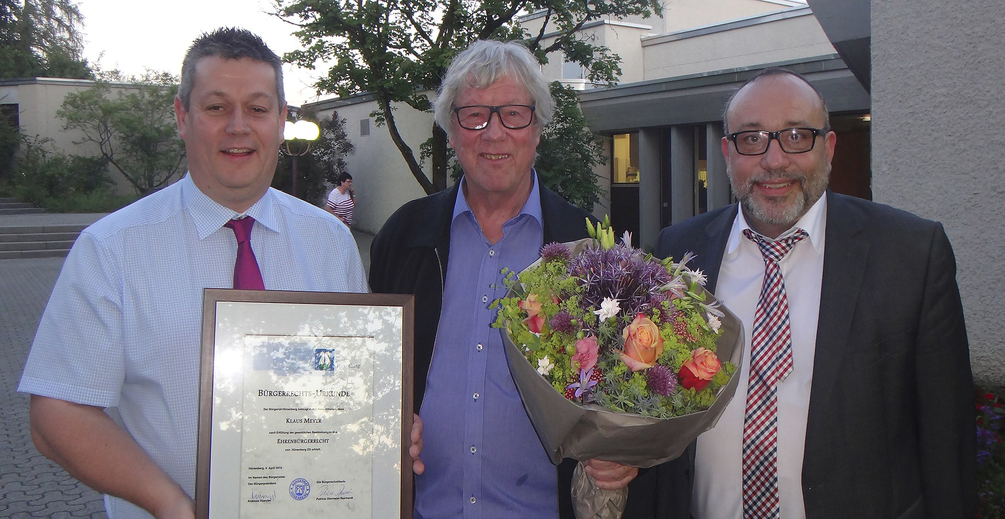 Der Bürgerrat hat an seiner Sitzung vom 9. April 2015, Klaus Meyer das Ehrenbürgerrecht von Hünenberg gemäss § 22 des kantonalen Einbürgerungsgesetzes verliehen. Damit setzt er ein Zeichen der Wertschätzung für seine ausserordentlichen Leistungen, insbesondere für das über 50-jährige kulturelle Schaffen in Hünenberg.