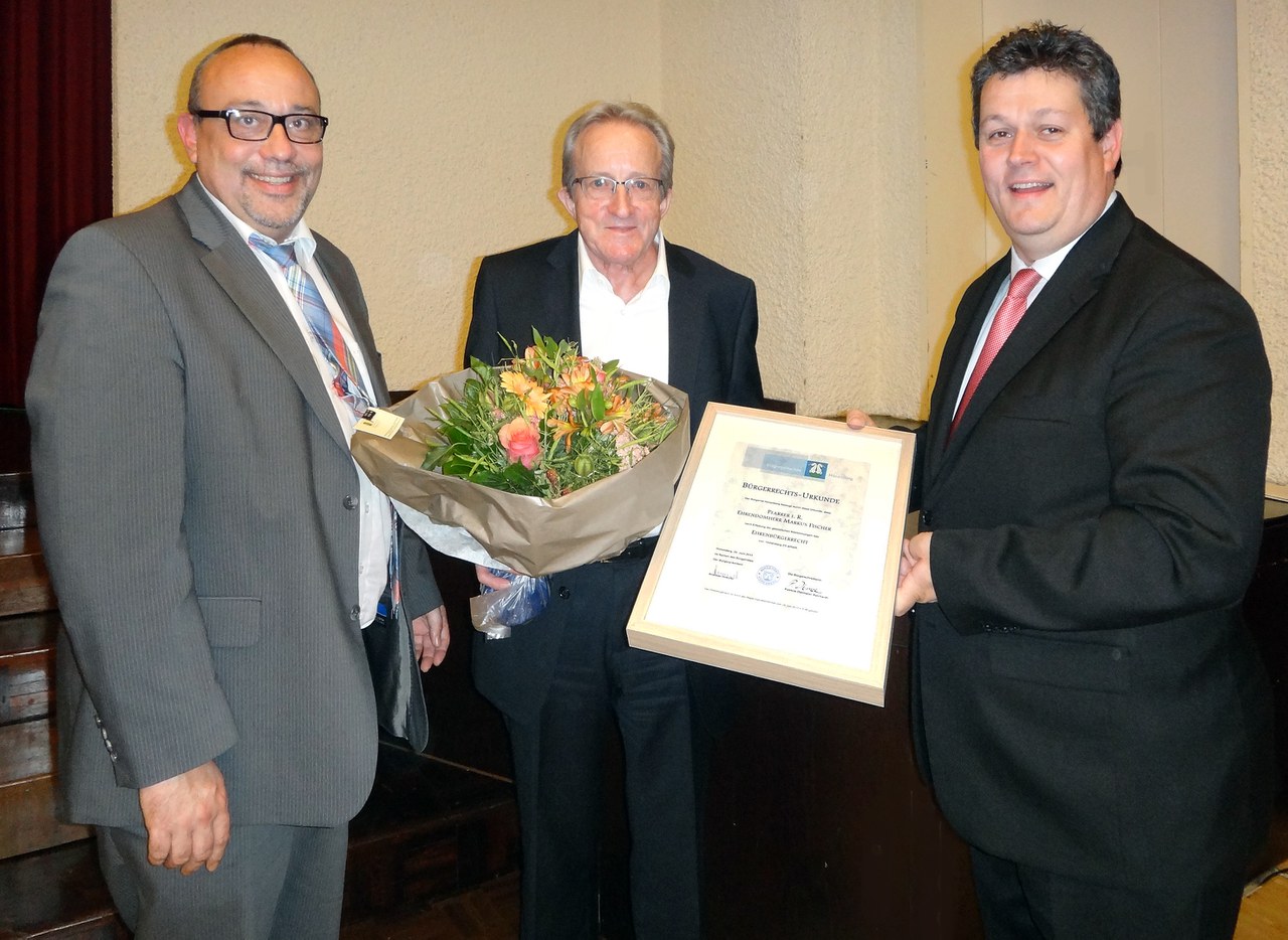Übergabe der Ehrenbürgerurkunde (vlnr): Bürgerpräsident Andreas Huwyler, Ehrenbürger Markus Fischer, Bürgerrat Beat Luthiger.