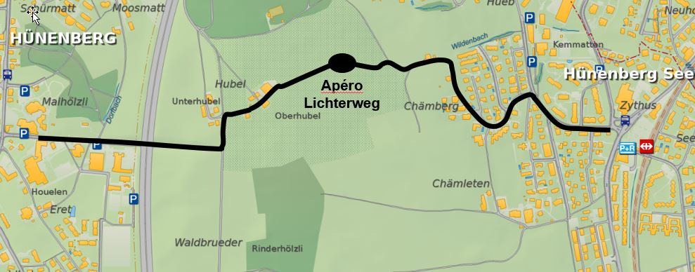 Der Lichterweg ist sowohl via öffentlichen Verkehr (Linien 41 und 51 Haltestelle «Dorf», sowie Linien 48 und S1 Haltestelle «Zythus») als auch mit Privatfahrzeugen (Parkplätze Zentrumstrasse und Zythus) bestens erreichbar.