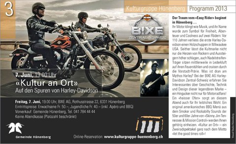 Ihr Motor klingt wie Musik, und ihr Name wurde zum Symbol für Freiheit, Abenteuer und Coolness auf zwei Rädern: Vor 110 Jahren verliess die erste Harley-Davidson einen Holzschuppen in Milwaukee USA. Seither lässt die Kultmarke nicht nur die Herzen von Rockern und Aussteigern höher schlagen, auch Nadelstreifen-Träger sitzen mittlerweile in Lederkluft auf ihren Feuerstühlen und cruisen durch die Vorstadt-Prärie. Was ist dran am Mythos Harley? Bei der BIXE AG Harley-Davidson Zentral-Schweiz erfahren Sie Interessantes über Geschichte, Technik und Design dieser legendären Marke – ein Hingucker nicht nur für Motorradfans!