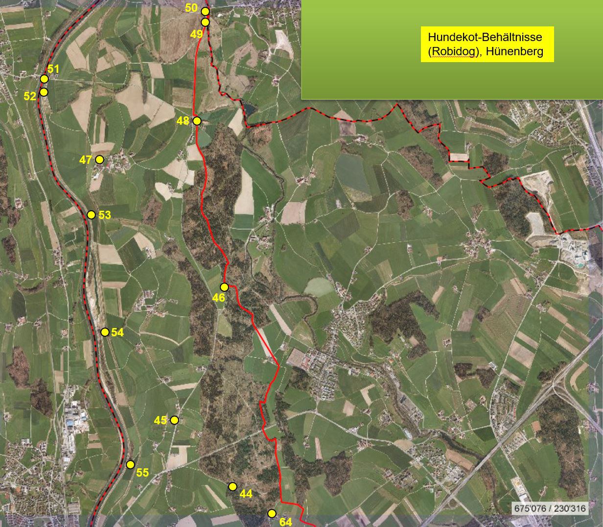 Wer einen Hund hat, ist verpflichtet, den Hundekot, den sein Tier auf Strassen, Plätzen, Gehwegen, Trottoirs, in öffentlichen Anlagen oder in landwirtschaftlichen Kulturen hinterlässt, sofort selber zu beseitigen. Der Hundekot ist in verknoteten Plastiksäckchen in die Hundekot-Container zu entsorgen. Das (vorübergehende) Deponieren von Hundekot-Beuteln am Wegrand etc. ist strafbar.