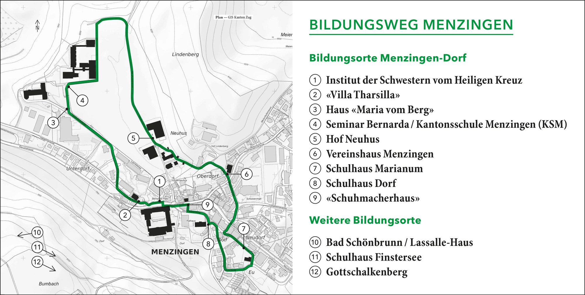 Bis heute ist das Ortsbild von Menzingen geprägt von Gebäuden, welche die eindrückliche Geschichte der Bildung am Berg sicht- und erfahrbar machen. Das Institutsgebäude der 1844 gegründeten Schwesternkongregation vom Heiligen Kreuz macht dabei den Auftakt. Dieses sowie das zugehörige Kandidatinnenhaus, das Pensionat (heute Altersresidenz «Maria vom Berg») und das Seminar Bernarda (heute Kantonsschule Menzingen) sind architektonische Zeitzeugen für die Bildung von Mädchen und jungen Frauen durch die Schwestern. Das gemeindliche Schulwesen wird durch das Schulhaus Dorf von 1934/35 und seinen Vorgängerbau im Zentrum von Menzingen sowie das alte und das neue Schulhaus in Finstersee repräsentiert. Das Schulhaus Marianum von 1939/40 gehörte einst zum gleichnamigen Waisenheim. Das Menzinger «Vereinshaus» und das «Schuhmacherhaus» sowie der Hof Neuhus verweisen auf die frühen handwerklichen und landwirtschaftlichen Ausbildungen. Aus den einst weitherum bekannten Kurhäusern Gottschalkenberg und Bad Schönbrunn (heute Lassalle-Haus) des 19. Jahrhunderts sind Bildungsorte geworden.
