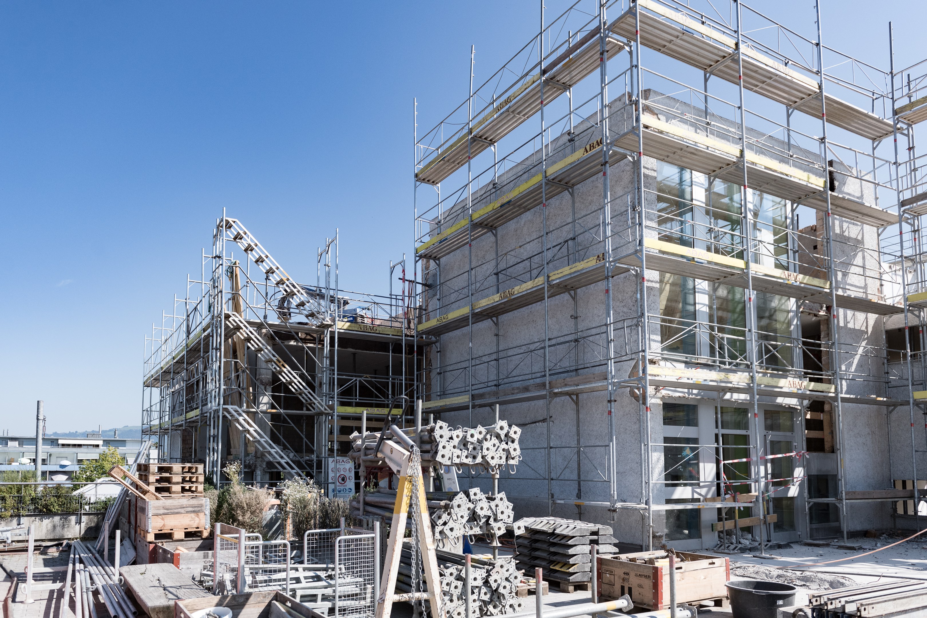 Das bestehende Gebäude wird nordseitig ab dem Erdgeschoss um die Fläche der Gruppenräume erweitert und um ein Stockwerk in Holzelementbau ergänzt. Ost- und westseitig sind Teilbereiche des Aufstockungsvolumens reduziert und als Dachterrassen ausgestaltet, dadurch erscheint der eher strenge Kubus etwas spielerischer und eleganter. Im Geschoss der Aufstockung sind ein Sitzungs- und Lehrerzimmer, die WC-Anlagen sowie ein Klassenzimmer mit dem dazugehörigen Gruppenraum angeordnet. Die geforderte Liftanlage wird nicht als neues Element aussen angebaut, sondern in den Korridorbereichen integriert. Dieser Standort ermöglicht auf jedem Geschoss eine sehr gute Zugänglichkeit und bei Bedarf auch eine Erschliessung der Turnhalle. Zusammen mit der nördlichen Erweiterung entsteht im Korridor-/Garderobenbereich eine Grosszügigkeit und gute Belichtung mit verschiedenen Sichtbezügen nach aussen. Alle Nasszellen werden am alten Standort belassen und neu organisiert. In den beiden unteren Geschossen sind vorgegebenen Nutzungen gemäss Raumprogramm umgesetzt und im bestehenden Volumen integriert.