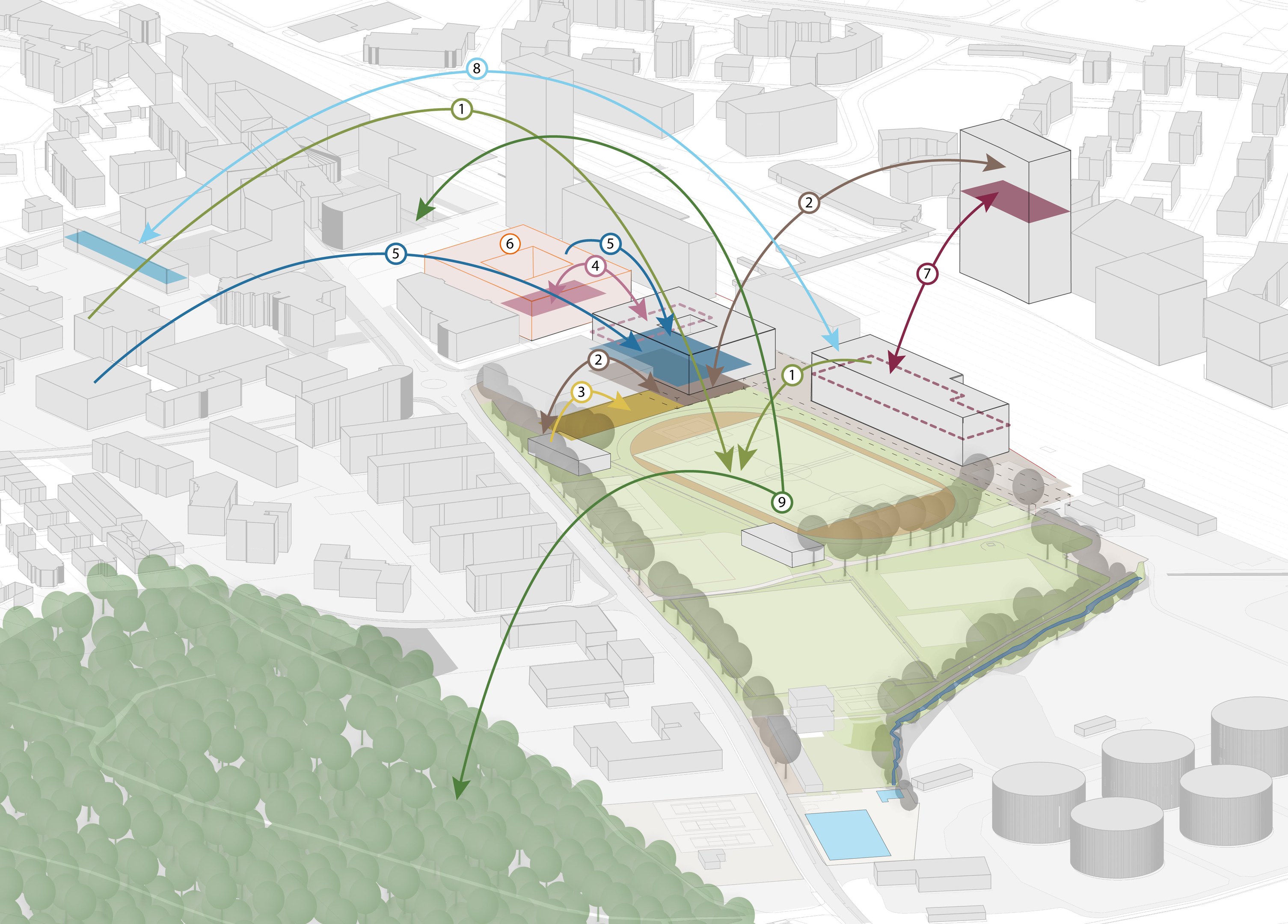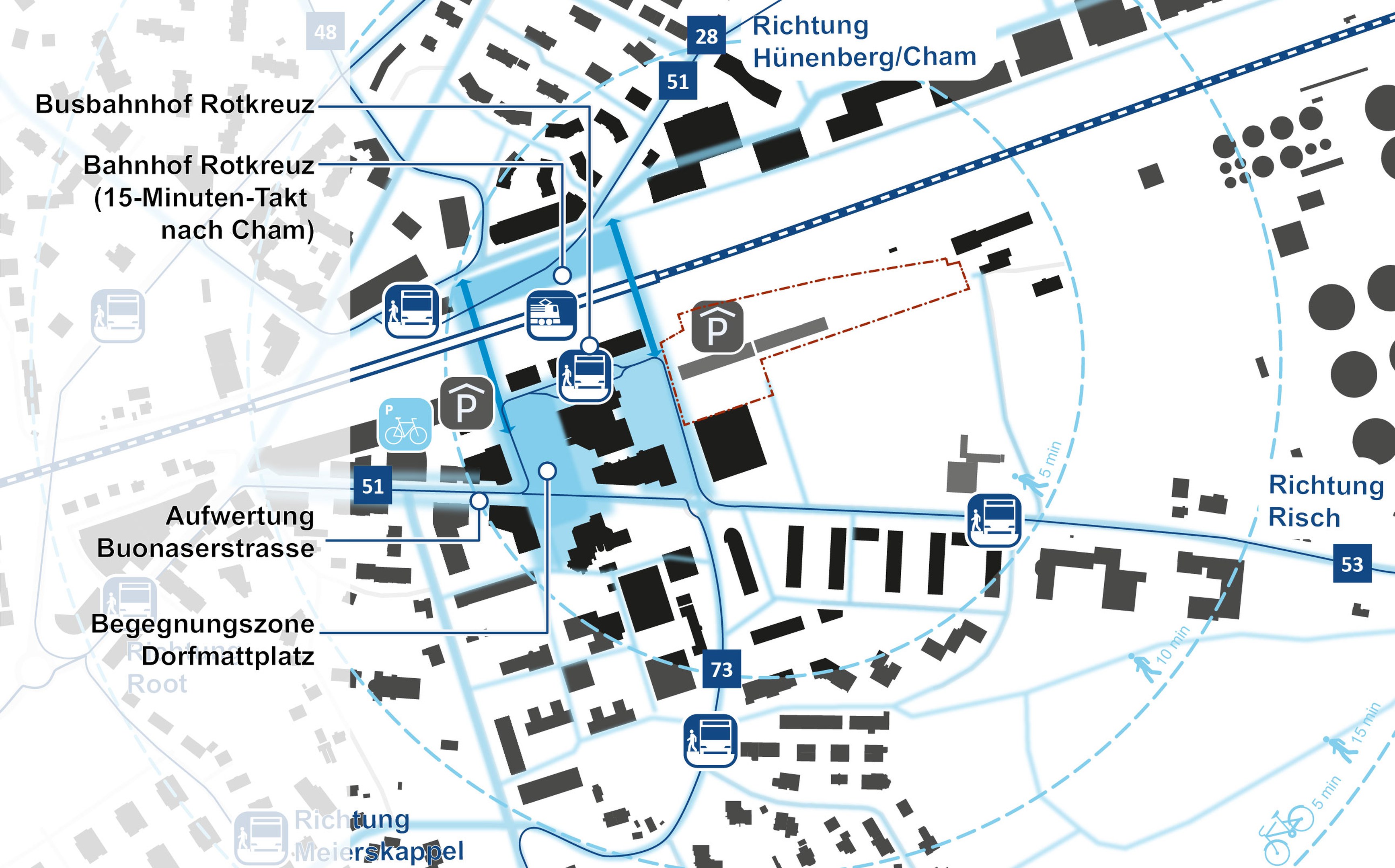 Der Regierungsrat hat die Zuger Gemeinden im Mai 2019 gebeten, bis Ende Juni 2020 mögliche Standorte für einen vierten Mittelschulstandort einzureichen. Die Gemeinde Risch hat diese Chance gepackt und ein Bewerbungsdossier eingereicht. Das potenzielle Areal für die neue Mittelschule befindet sich an zentraler Lage in Rotkreuz: nördlich wird es begrenzt durch die Gleise der SBB-Linie Luzern – Zug – Zürich, südlich vom Sportpark Rotkreuz mit seinen Sport- und Freizeitnutzungen. Der bebaubare Perimeter umfasst eine Fläche von ca. 12'400 m² und ist im Eigentum der SBB Schweizerische Bundesbahnen (Parz. 860, 29, rund 60 %) und der Einwohnergemeinde Risch (Parz. 714, rund 40 %). Aktuell befinden sich auf dem Areal ein Festplatz, Parkplätze der SBB (Park+Rail), Flächen des Ökihofs (Recyclinghof) und das Sportparkgebäude.