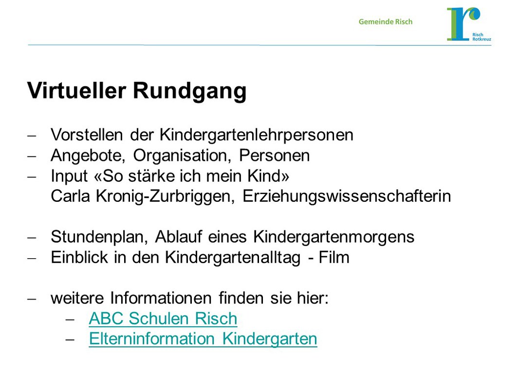 An dieser Veranstaltung wird en Einblick in den Alltag des Kindergartens ermöglicht. Die Kindergartenlehrpersonen und die Schulleitung freuen sich, Sie an dieser Informationsveranstaltung willkommen zu heissen. Für telefonische Auskünfte steht Ihnen die Administration oder die Schulleitung während den Öffnungszeiten unter Tel. 041 798 09 20 zur Verfügung.