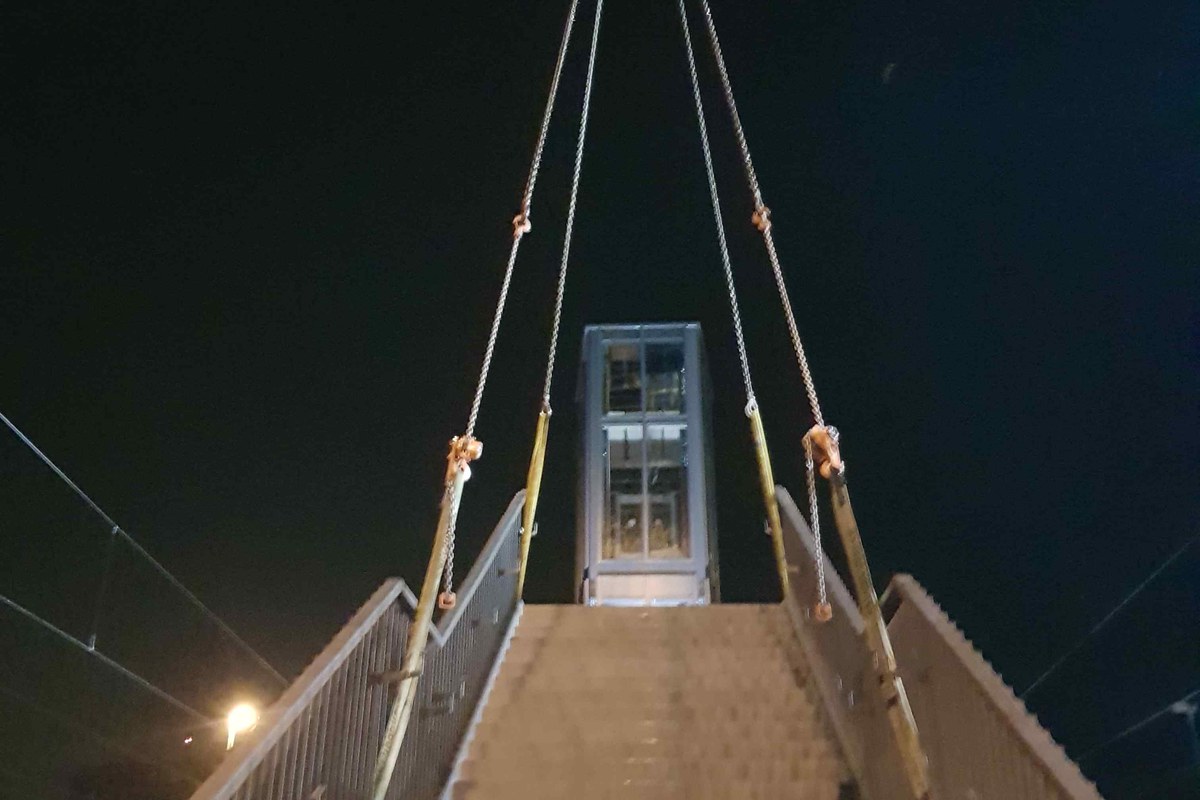 Die Lifttürme sind als allseitig verglaste Stahlkonstruktionen ausgebildet, wobei die Seitenflächen mit profiliertem Glas verkleidet werden. Durch die Anbindung der Lifttürme an die Brücke können die Stahlprofile schlank ausgebildet werden. Die Lifte haben auf Perron und Brückenniveau je eine Türe.