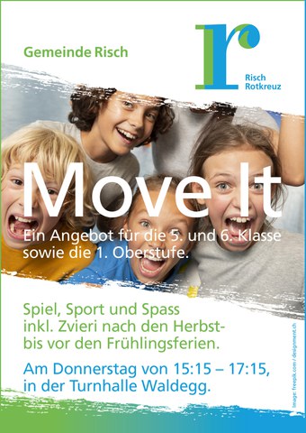 Das 'move it' findet immer im Winterhalbjahr statt, also ab den Herbst- bis zu den Frühlingsferien. Alle 5. und 6.-Klässler sind willkommen, sich jeweils am Donnerstag von 15.15 - 17.15 Uhr in der Turnhalle Waldegg für Spiel, Sport und Spass zu treffen. Es gibt ein Zvieri mit 'Äpfel und Brot' und etwas zu trinken. Schüler und Schülerinnen der 1.Oberstufen-Klassen mit 'move it'-Heimweh dürfen ebenfalls hereinschauen.