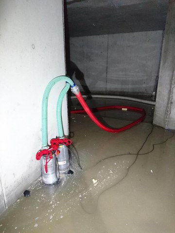 Durch den intensieven Regen in der Nacht wurde das ganze Untergeschosses eine Rohbaus mit Wasser gefüllt. Nach Absprache mit dem Polier wurde eine Schmutzwasserpumpe platziert und in Betrieb genommen. Es musste eine längere Leitung zum nächsten Kanalisationsschacht gelegt werden.