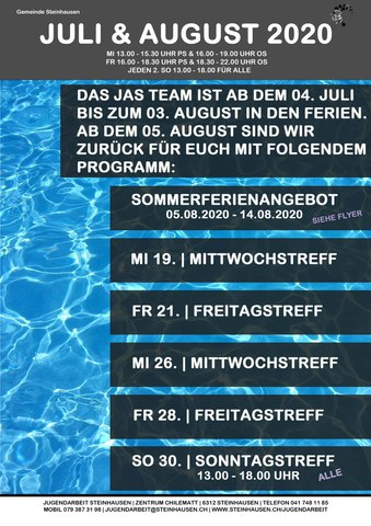06.07.2020Monatsprogramm Juli & AugustIm Monatsprogramm finden sie alles was in diesen zwei Monaten im Jugentreff statt findet.https://publisher-zgch-test.webcloud7.ch/izug/platform/behoerden/gemeinden/steinhausen/jugendarbeit/infos/aktuelles/monatsprogramm-juli-august-1https://publisher-zgch-test.webcloud7.ch/izug/platform/logo.png