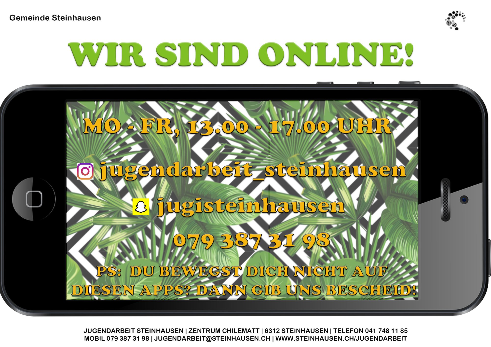 07.04.2020Wir gehen Online!Folge uns auf Instagram und Snapchat.https://publisher-zgch-test.webcloud7.ch/izug/platform/behoerden/gemeinden/steinhausen/jugendarbeit/infos/aktuelles/wir-gehen-online-1https://publisher-zgch-test.webcloud7.ch/izug/platform/logo.png