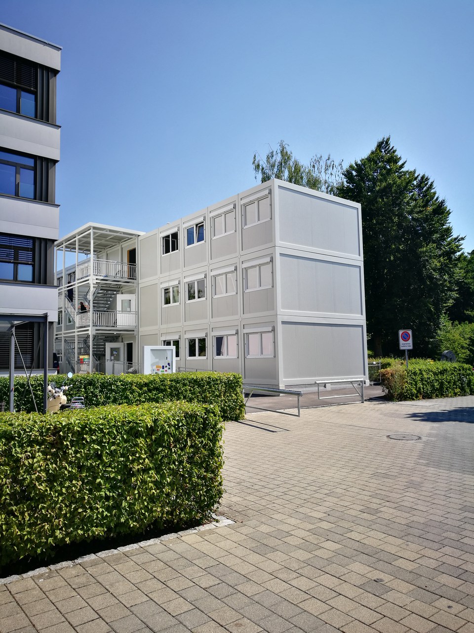 Die Aufstockung des Container-Provisoriums erfolgte während den Schulferien. Für das Erreichen der beiden oberen Stockwerke, wurde die Aussentreppe ergänzt. Die Räume konnten pünktlich zum Schulbeginn am 22. August 2022 der Schule übergeben werden.