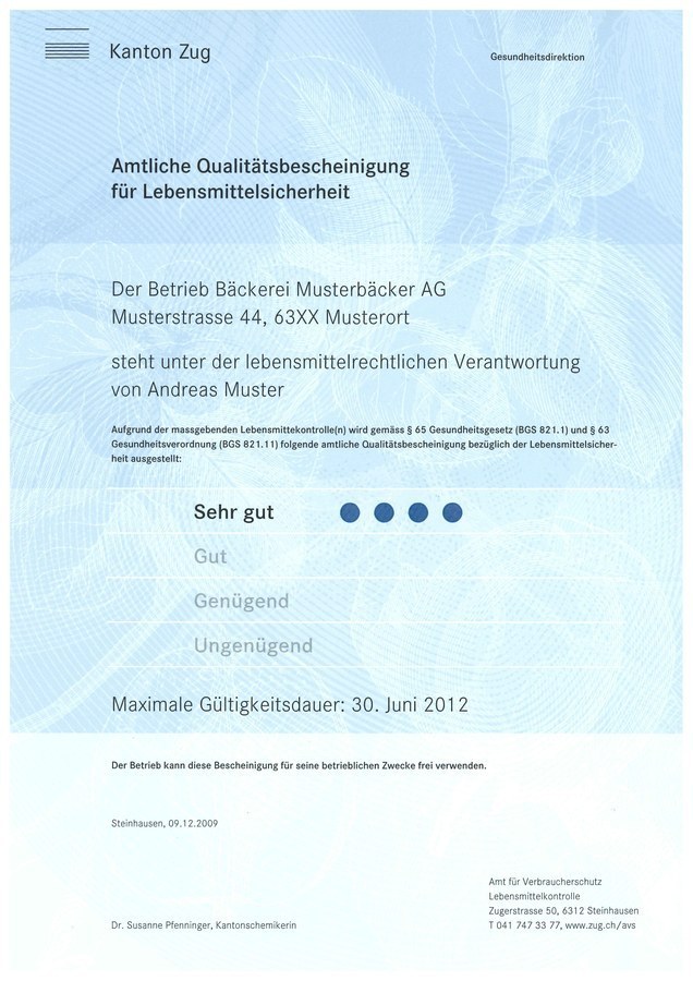 2009 hat der Kanton Zug als erster Kanton die amtliche Qualitätsbescheinigung für Lebensmittelbetriebe eingeführt. Die amtliche Bescheinigung eines Betriebes, eine Art Hygienezeugnis, zeigt die Bewertung der Lebensmittelkontrolle in übersichtlicher und zusammenfassender Weise. Auf einen Blick erkennt man die Gesamtbeurteilung eines Betriebes. Mit diesem Instrument kann innerhalb der Branche die Bewertung verglichen werden. Entspricht die Bewertung nicht den Erwartungen, kann dies Anreize zur Verbesserung setzen. Für die Lebensmittelkontrolle ermöglicht dieses Anreizsystem, bei Kontrollen gezielter vorzugehen und die Kontrollfrequenzen zu optimieren.