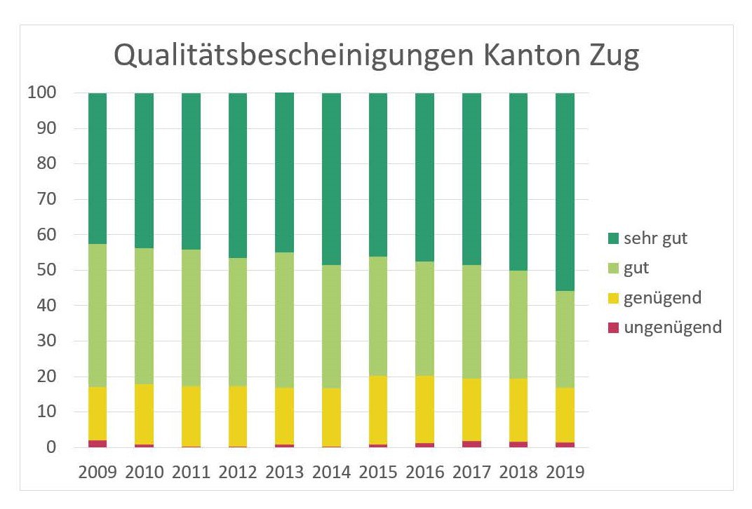 Die Ergebnisse sind nach 10 Jahren erfreulich: Über 80 % der Betriebe sind als «sehr gut» oder «gut» beurteilt. Es zeigt sich zudem, dass im Verlauf der letzten zehn Jahre mehr Betriebe als «sehr gut» eingestuft wurden; der Anteil Betriebe mit der Bewertung «gut» hat dafür leicht abgenommen. Der Anteil «genügender» Betriebe lag im gesamten Beurteilungszeitraum  zwischen 15 und 20 %, der Anteil «ungenügender» Betriebe war immer unter 2 %. Das Total der beurteilten Betriebe stieg von 574 auf 655 in den letzten zehn Jahren.