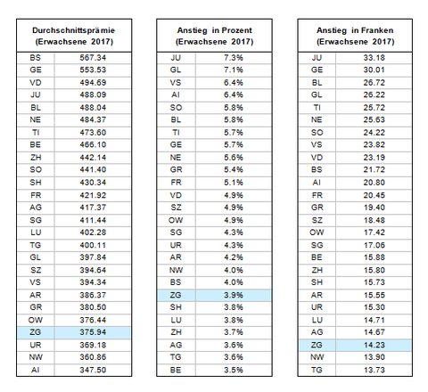Auf das Jahr 2017 rückt Zug in der Rangliste der prämiengünstigsten Kantone vom sechsten auf den vierten Platz vor. Mit 3.9 Prozent liegt die Erhöhung der Durchschnitts¬prämien für Erwachsene zudem unter dem schweizerischen Mittelwert.