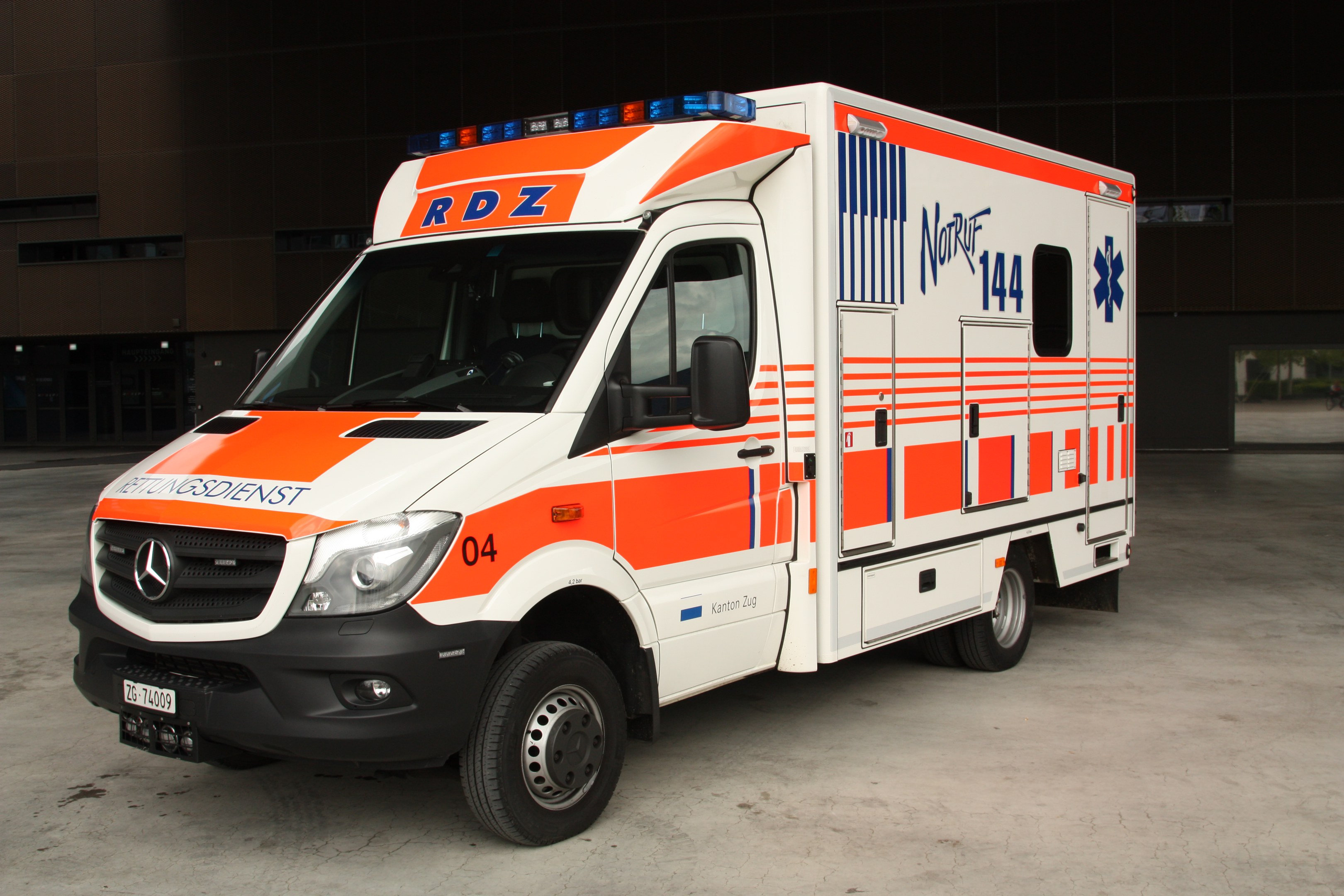 Der Rettungsdienst Zug (RDZ) führt Notfalleinsätze sowie Verlegungstransporte mit Rettungswagen (RTW) vom Typ Mercedes Sprinter 518/519 mit Kofferaufbau durch. Drei der sechs RTW verfügen über einen 4x4 Antrieb. Die RTW sind mit allen nötigen Kommunikationsmitteln, einem Navigationssystem und umfangreichem Kartenmaterial ausgestattet. Für die Rettung und Betreuung der Patienten stehen alle nötigen Bergemittel, medizintechnischen Geräte und medizinischen Verbrauchsmaterialien zur Verfügung. Die RTW sind mit zwei diplomierten Rettungssanitäterinnen und Rettungssanitäter besetzt.