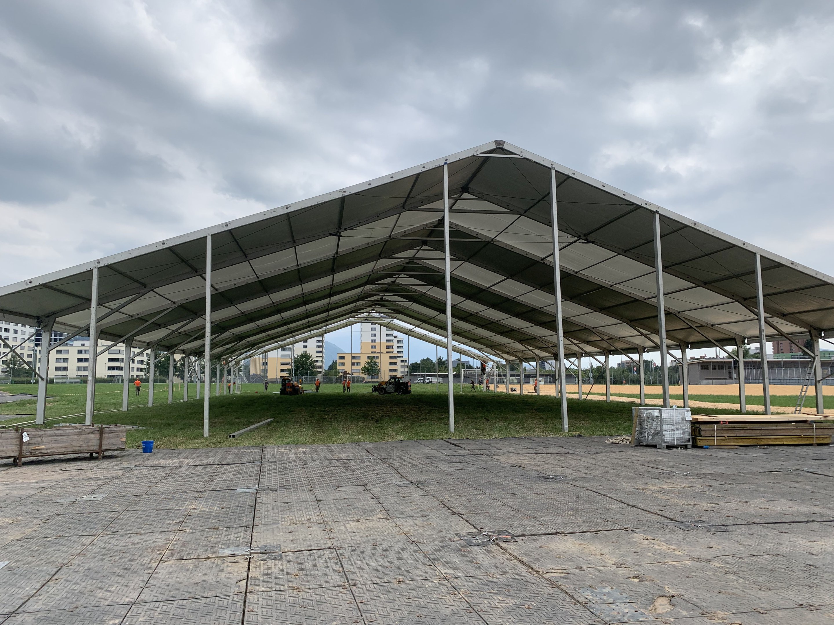 Bild 2: Aufbau Zelt und Verlegen der Bodenplatten