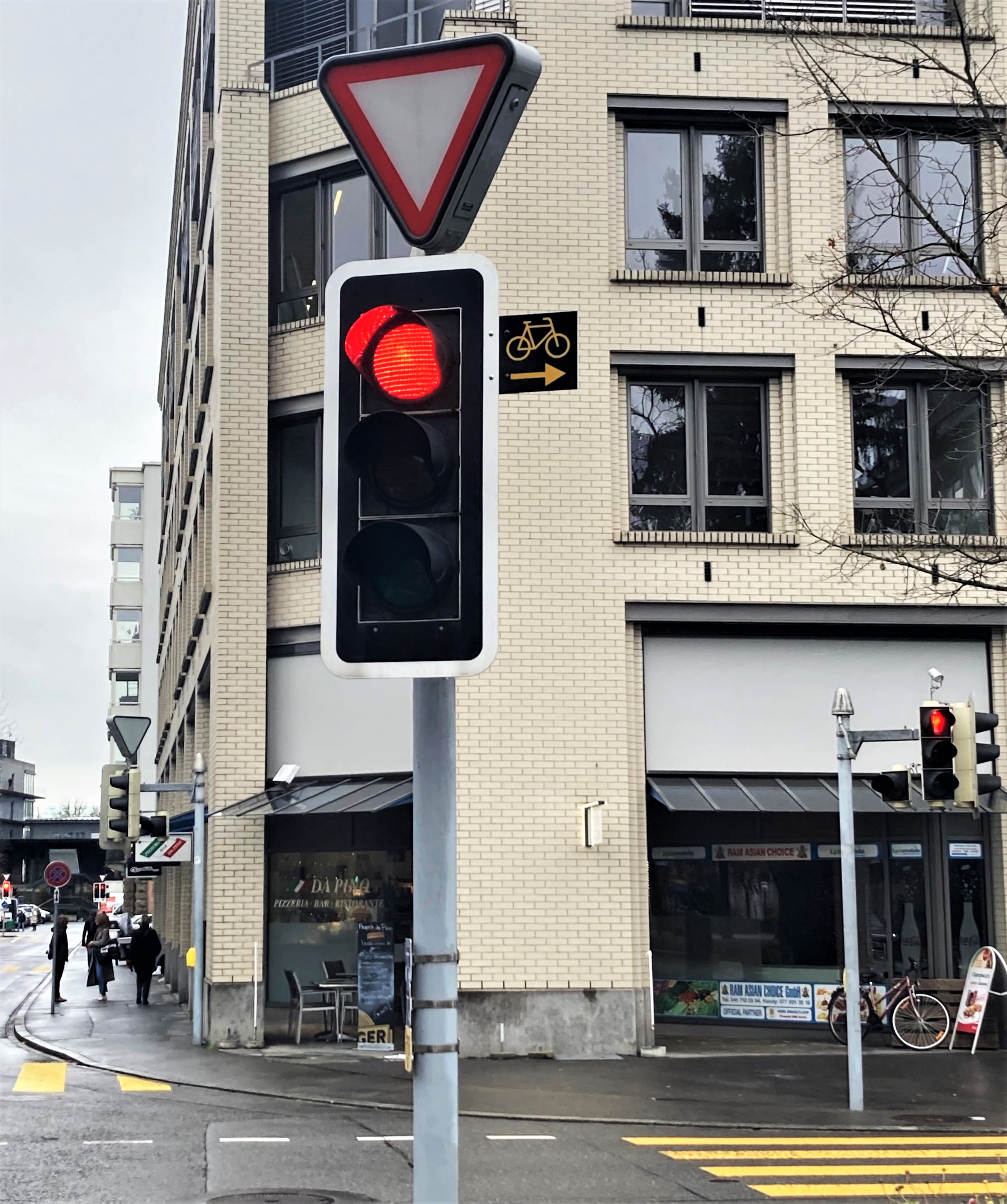 Seit Januar 2021 ist für Velos, e-Bikes und Mofas das Rechtsabbiegen bei Rotlicht an Verkehrsknoten erlaubt, wenn sie entsprechend signalisiert sind. Wo dies ohne Gefahren möglich ist, sind die Signalisationen in den letzten Tagen angebracht worden (Zusatzschilder neben den Rotlichtern; gelbes Velo und gelber Pfeil auf schwarzem Grund).