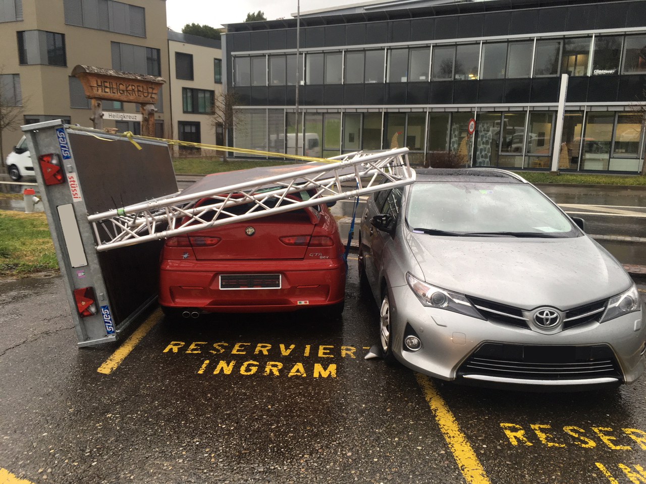 Auf einer Kontrollfahrt in der Gemeinde Oberwil wurde ein Patrouillenfahrzeug der Zuger Polizei von einem umstürzenden Baum getroffen. Auch in der Gemeinde Edlibach stürzte ein Baum auf ein Fahrzeug. Zudem kippte in der Gemeinde Cham ein abgestellter Werbeanhänger zur Seite und stürzte auf zwei parkierte Fahrzeuge. In allen Fällen wurde niemand verletzt.