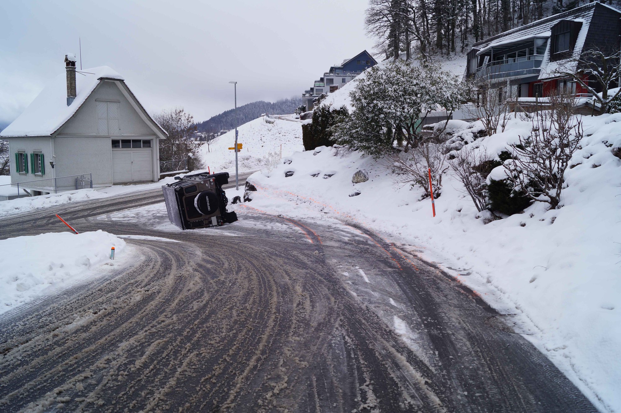 Ein Geländewagen ist auf der schneebedeckten Strasse ins Rutschen gekommen und auf die Seite gekippt. Verletzt wurde niemand.