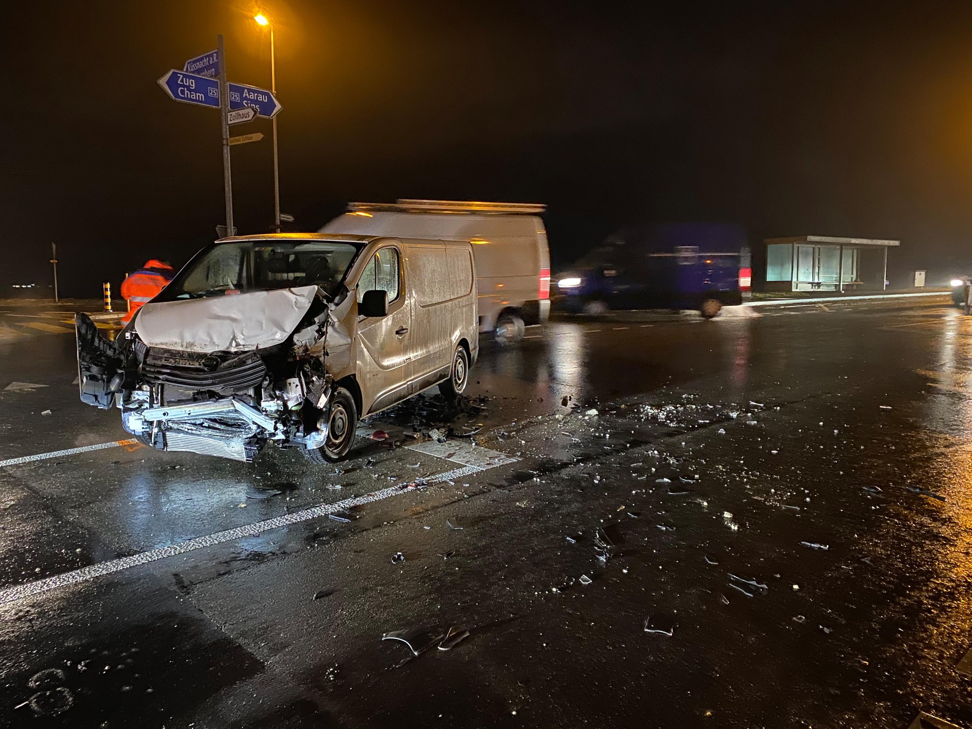 Der erste Unfall ereignete sich am Mittwochmorgen (13. Januar 2021), kurz vor 06:30 Uhr, im Bereich «Zollhaus» in der Gemeinde Hünenberg. Ein 22-jähriger Lieferwagenlenker fuhr auf der Sinserstrasse in Richtung Cham. Gleichzeitig beabsichtigte ein 40-jähriger Lieferwagenlenker, von der Drällikonerstrasse nach links in die Sinserstrasse, einzubiegen. Weil er dabei den Vortritt missachtete, kam es zu einem heftigen Zusammenprall zwischen den beiden Fahrzeugen.