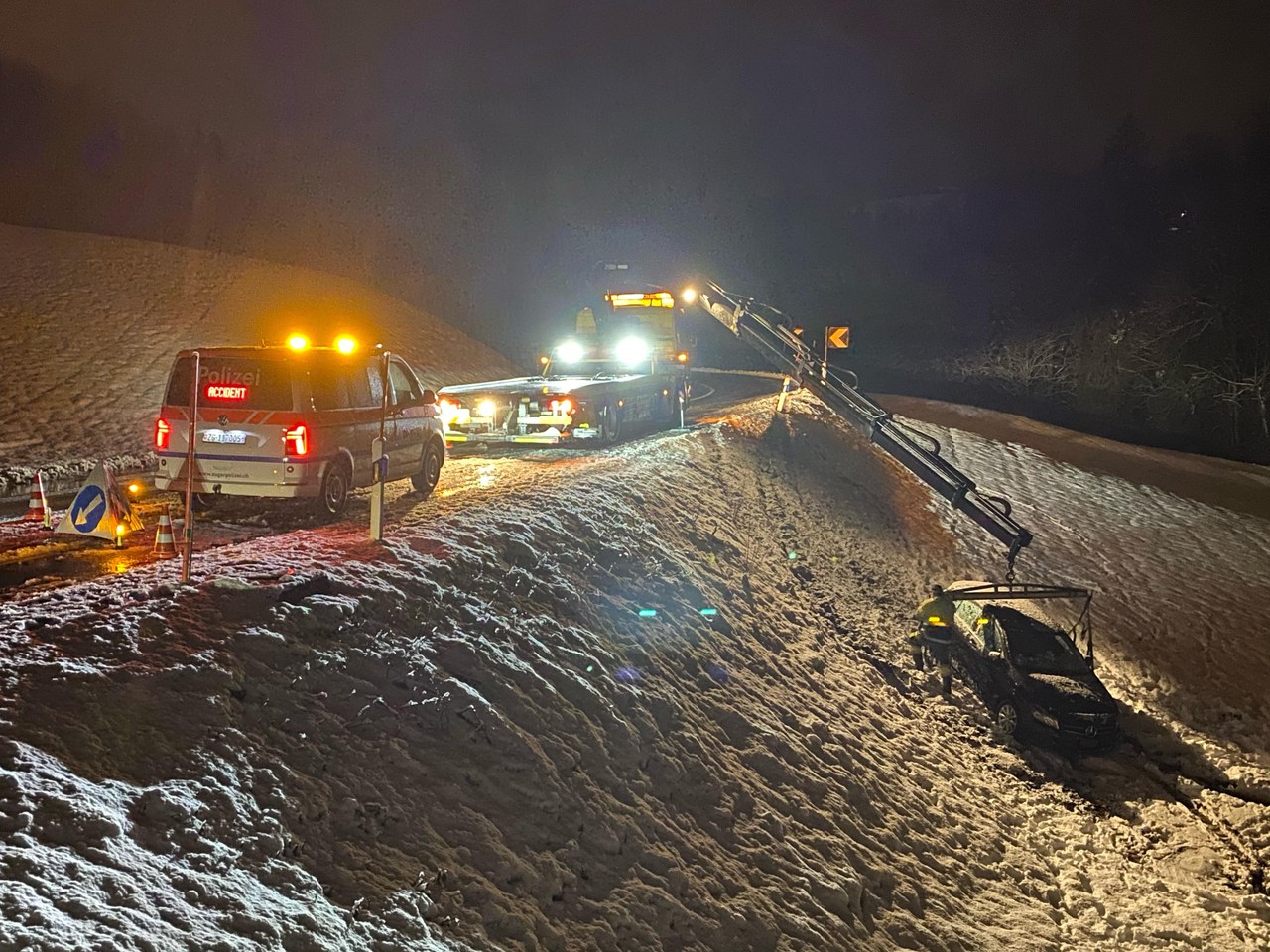 Ein Auto ist auf der schneebedeckten Strasse von der Fahrbahn gekommen und hat sich überschlagen. Die Lenkerin wurde leicht verletzt. Das Auto musste von einem Kran geborgen werden.