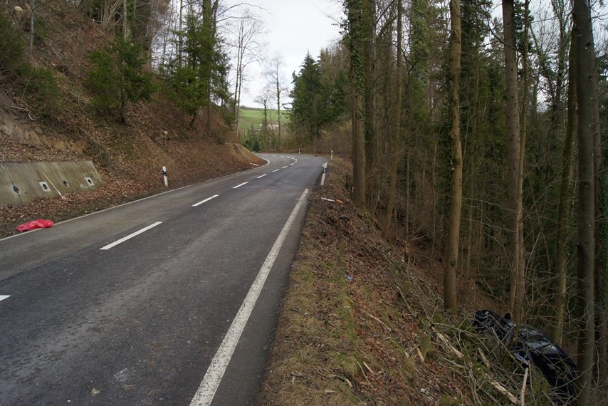 Ein junger Mann kam von der Strasse ab. Sein Auto stoppte im Abhang zwischen den Bäumen.