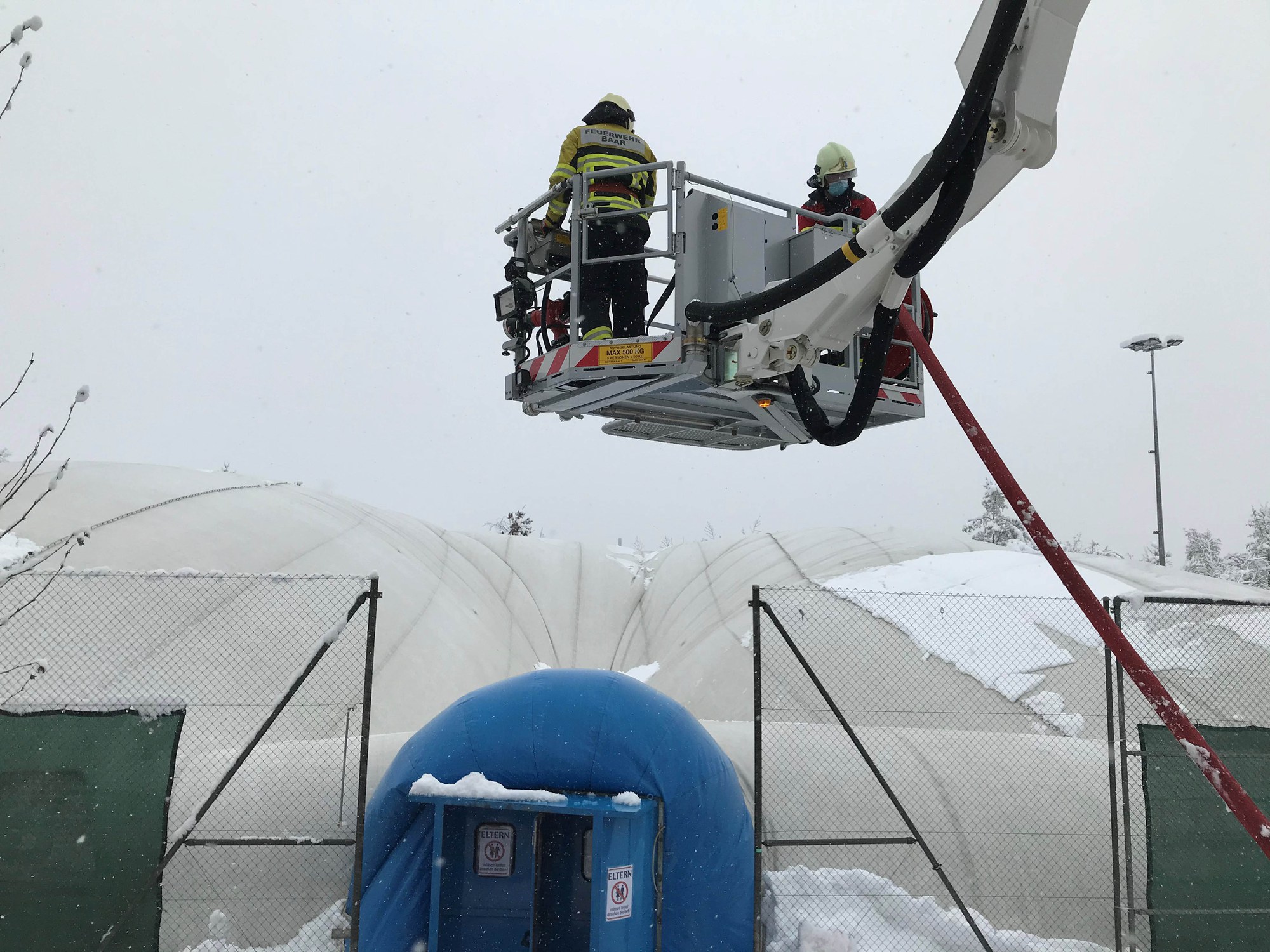 Weiter musste die Feuerwehr Baar eine Traglufthalle eines Tennisclubs vom Schnee befreien. Diese war unter der enormen Schneelast bereits teilweise eingedrückt und drohte total einzustürzen.
