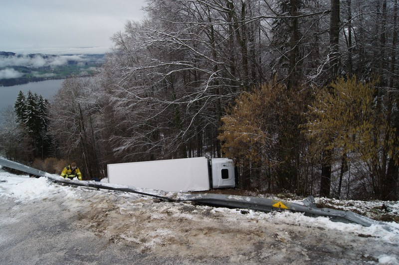 Am Mittwoch (3. Februar 2016), kurz nach 11:00 Uhr, kam es auf der Vorderbergstrasse in Walchwil zu einem Selbstunfall. Ein Lastwagen, der mit rund zwölf Tonnen Käse beladen war, kam auf der mit Schnee bedeckten Fahrbahn ins Rutschen und kollidierte mit der Leiteinrichtung. In der Folge kippte er auf die Seite und rutschte rund 28 Meter die Böschung hinunter. Der 58-jährige Chauffeur blieb unverletzt und konnte die Führerkabine selbstständig verlassen.