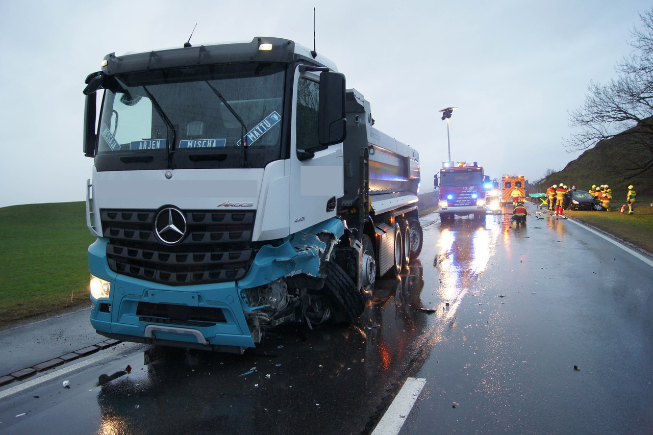 Ein Autolenker gerät auf die Gegenfahrbahn und prallt in einen Lastwagen. Der 23-jährige Mann wurde im Auto eingeklemmt und verletzt.