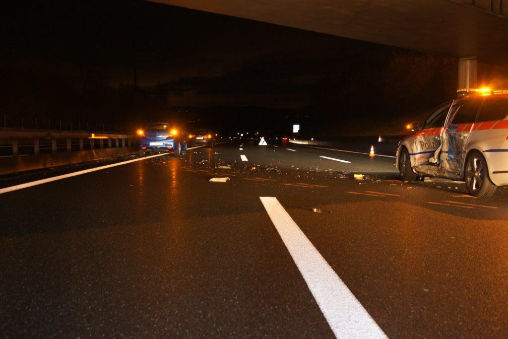 Am Sonntag (21. Februar 2016), kurz nach 04:00 Uhr, kam es auf der Autobahn A4 in Hünenberg, Fahrtrichtung Zürich, zu einer Kollision zwischen einem Personenwagen und einem abgestellten Polizeifahrzeug.