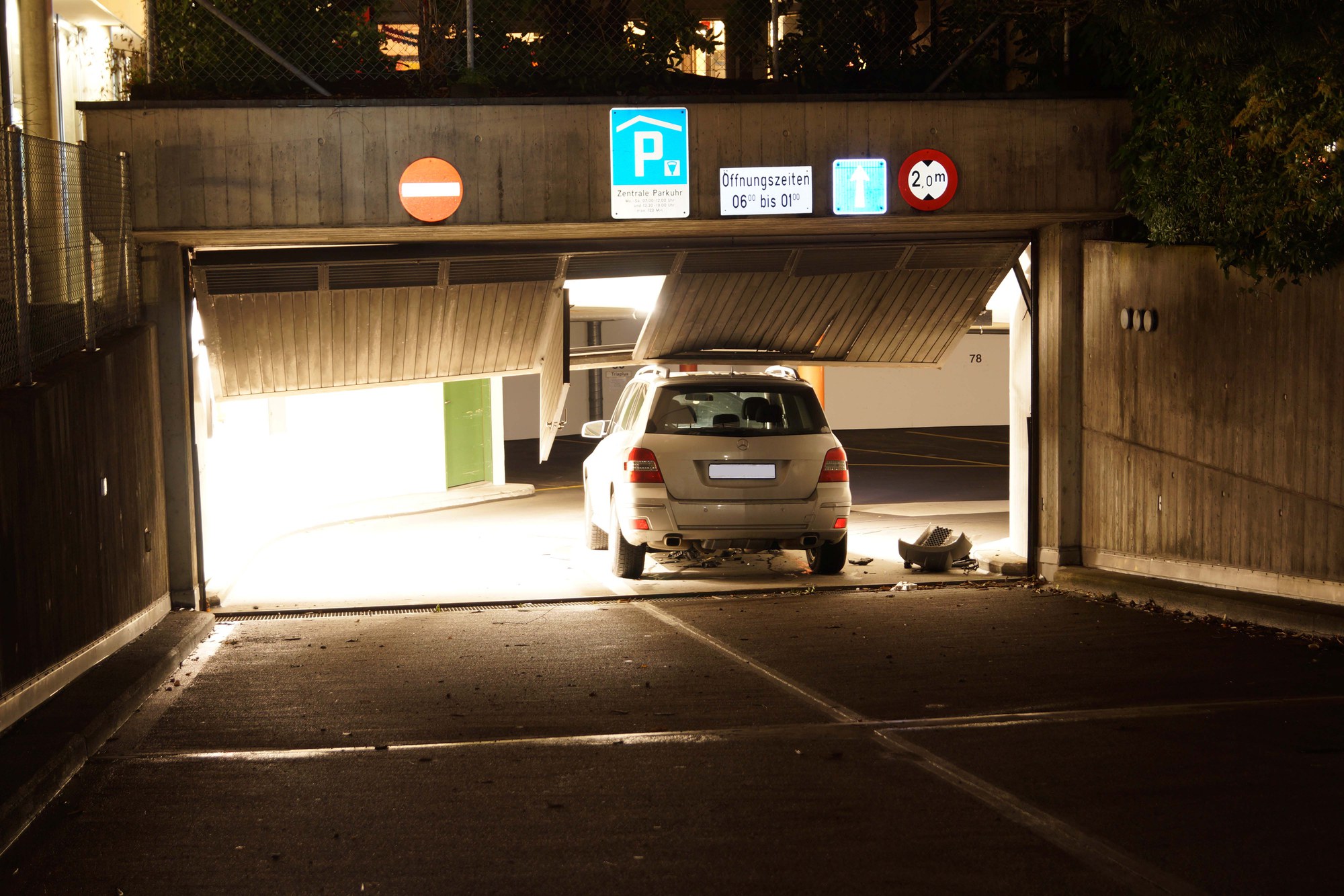 Dabei wurde das massive Stahltor nach oben gedrückt, worauf das Auto weiter nach unten fuhr und in die dortige Leiteinrichtung prallte. Verletzt wurde niemand. Die Höhe des Sachschadens kann noch nicht beziffert werden, ist jedoch beträchtlich.