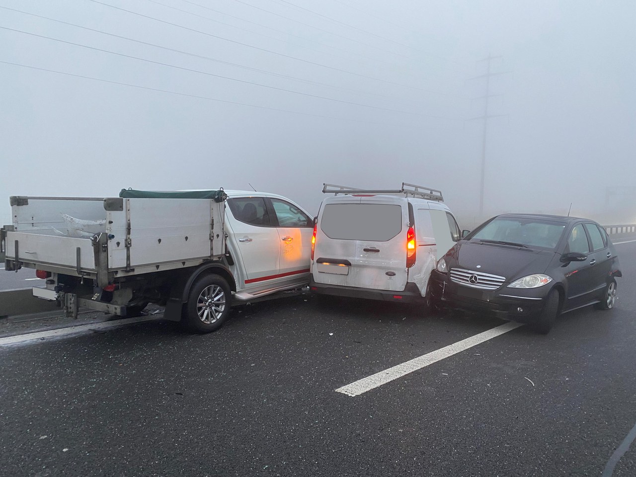 Der erste Unfall ereignete sich um 06:15 Uhr zwischen der Verzweigung Rütihof und Lindencham in Fahrtrichtung Zug. Ein 32-jähriger Lieferwagenlenker realisierte zu spät, dass sich der Verkehr vor ihm staute und prallte in das Heck des vor ihm stehenden Autos. Ein nachfolgender, dritter Fahrzeuglenker konnte ebenfalls nicht mehr rechtzeitig bremsen, prallte in den Lieferwagen sowie in die Mittelleitplanke.
