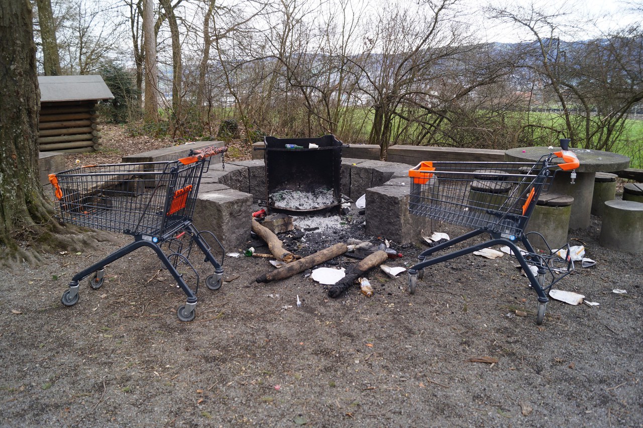 Eine unbekannte Täterschaft hat den Grillplatz «Spiess» im Städtlerwald in Cham verunreinigt. Sie hinterliess diverse Kleinabfälle sowie zwei Einkaufswagen. Eine entsprechende Meldung ist am Sonntagmittag (23. Februar 2020) bei der Zuger Polizei eingegangen. Die ausgerückten Einsatzkräfte stellten zudem fest, dass einer der beiden Einkaufswagen durch den Einfluss von Hitze beschädigt worden war.