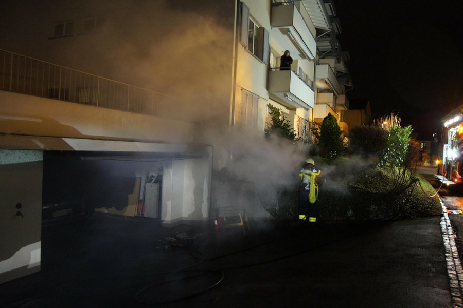 Anwohner vernahmen kurz nach 19:00 Uhr einen lauten Knall aus einer Garagenbox am Lüssiweg. Wenig später züngelten bereits die ersten Flammen aus dem Einstellraum. Einem Fahrzeughalter gelang es gerade noch rechtzeitig, sein Auto in Sicherheit zu bringen. Danach begann er unverzüglich, das Feuer zu bekämpfen. Die alarmierte Freiwillige Feuerwehr der Stadt Zug (FFZ) konnte den Flammen schliesslich den Garaus machen.